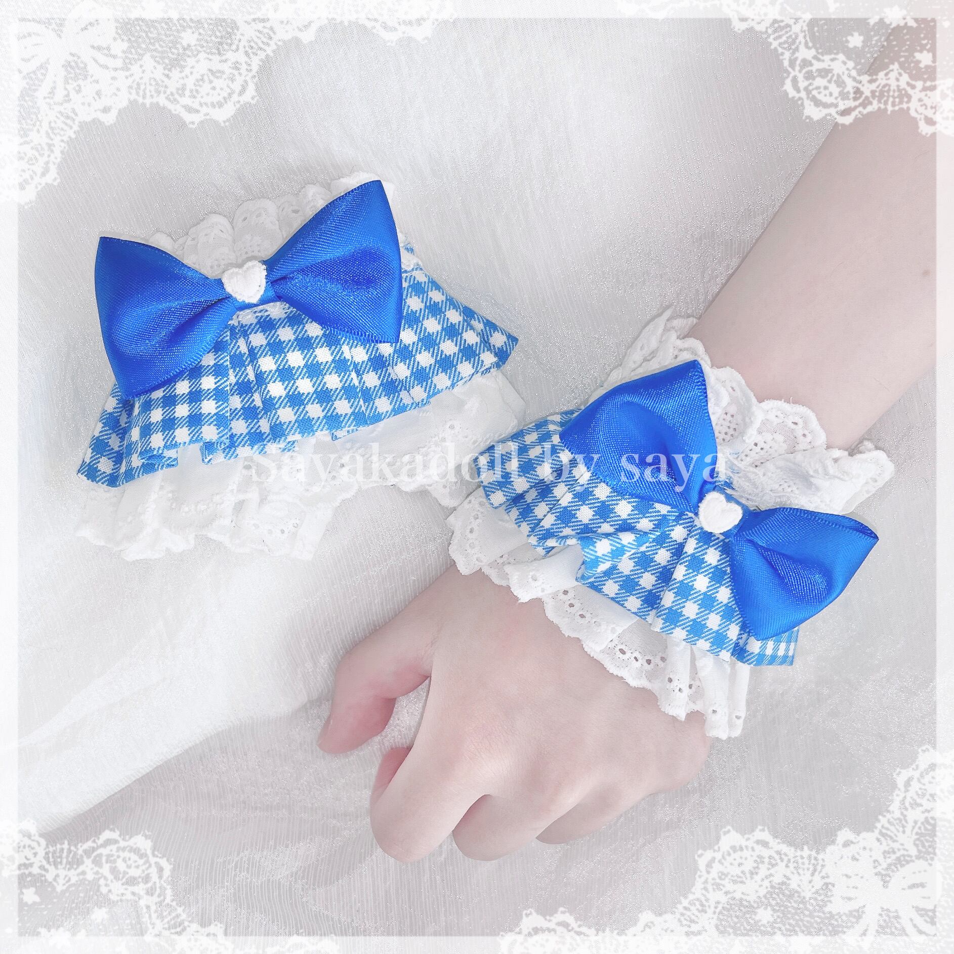 ♡ Candy チェック柄 フリルレースリボン お袖留め blue ♡