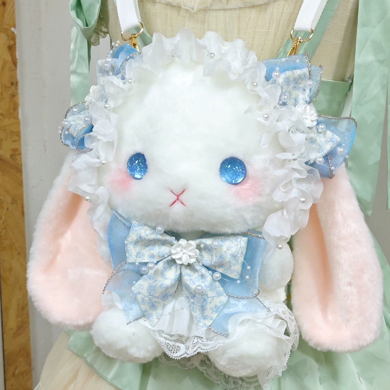 フリルやリボン、パールが沢山ついていてふわふわのうさぎさんです₍ᐢ⸝⸝› ‹⸝⸝ᐢ₎パールのお花パーツと、散りばめられているパールのパーツが可愛いです♡