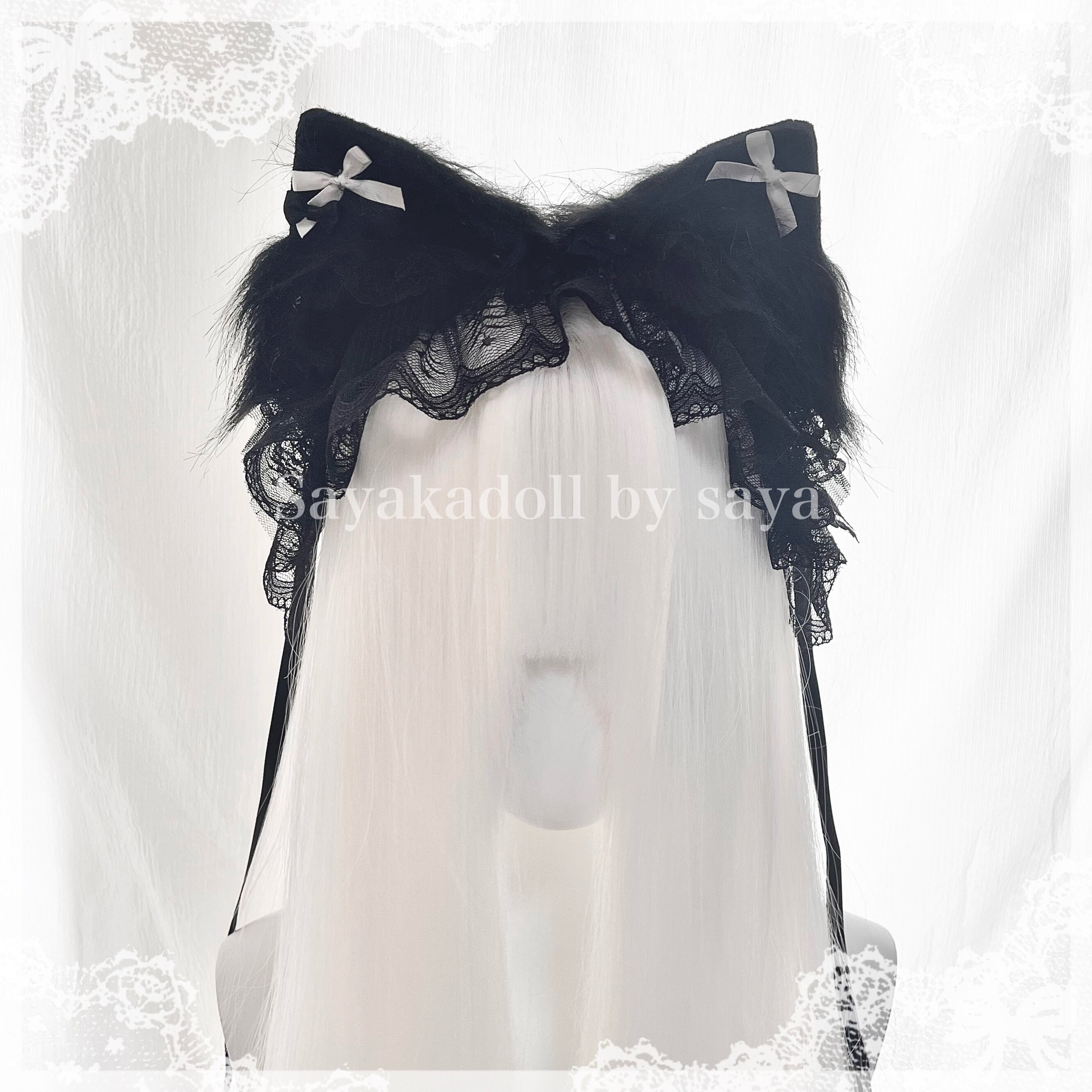 ♡【全4色】Black cat 猫耳 ボンネット風フリルリボンヘッドドレス black×white ♡