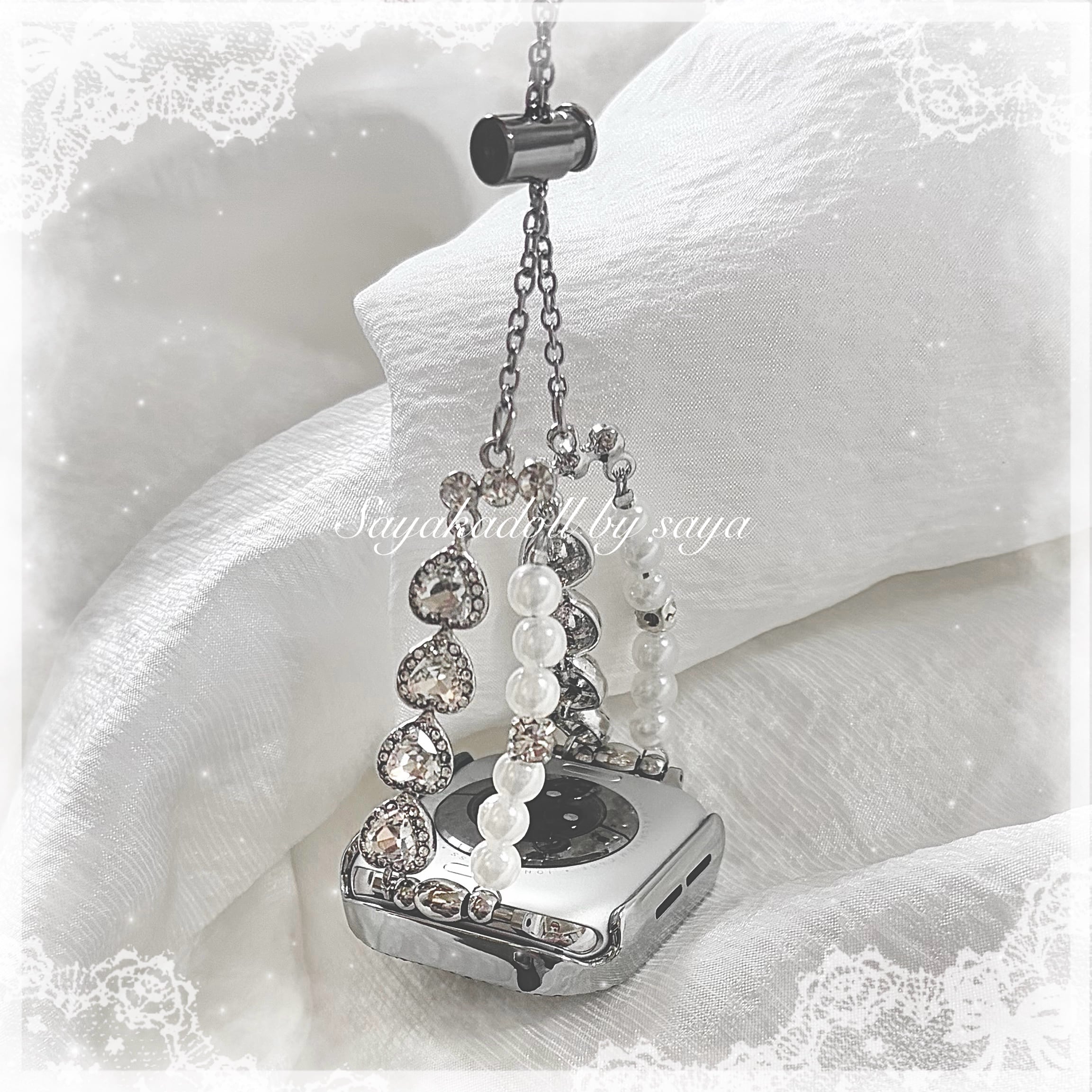 ♡【全2色】Apple watch バンド/チェーン クリスタルハート ビジューパール 42mm white ♡