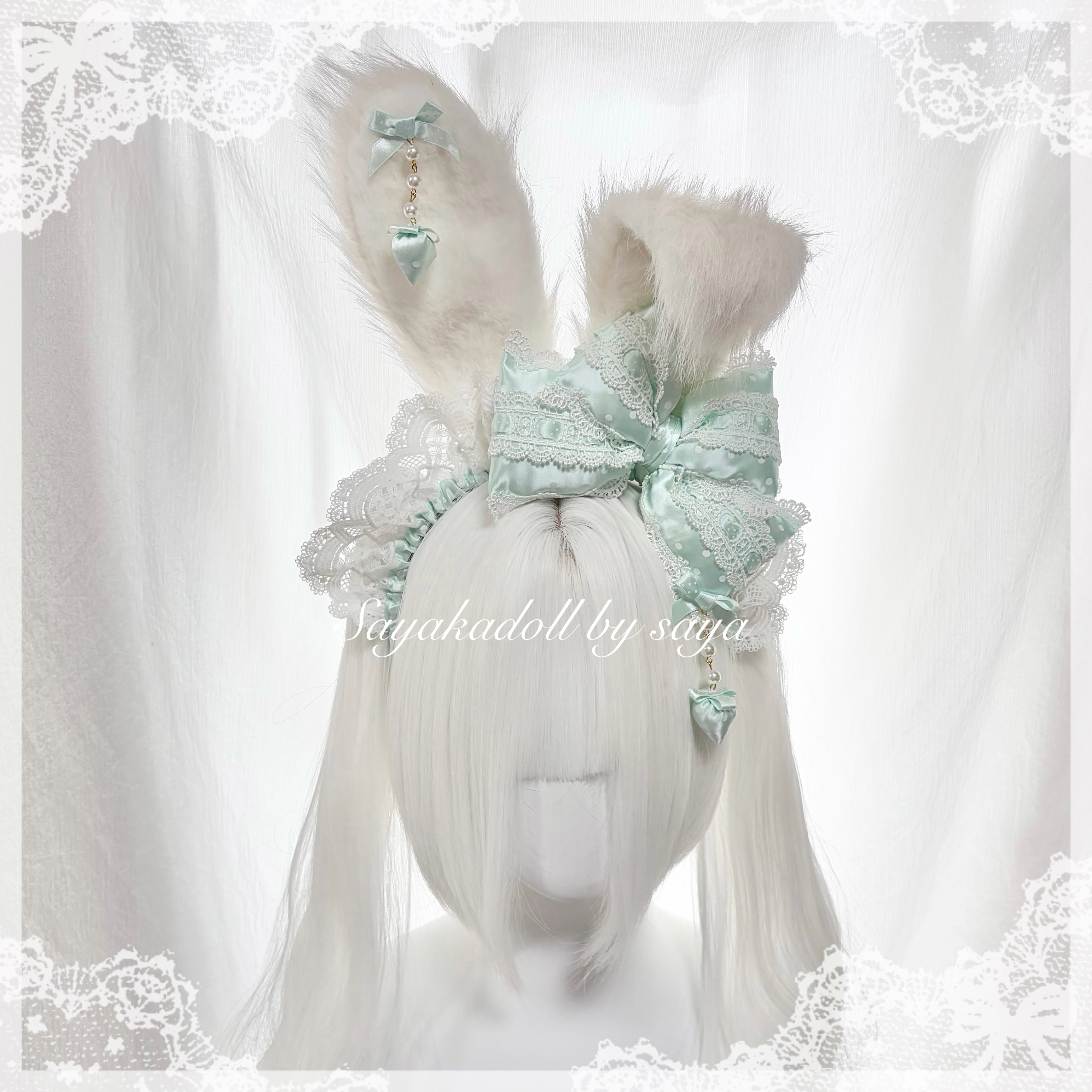 ♡【MAID】Strawberry ドット柄リボン 変幻自在うさみみフリルカチューシャ 3way light blue ♡