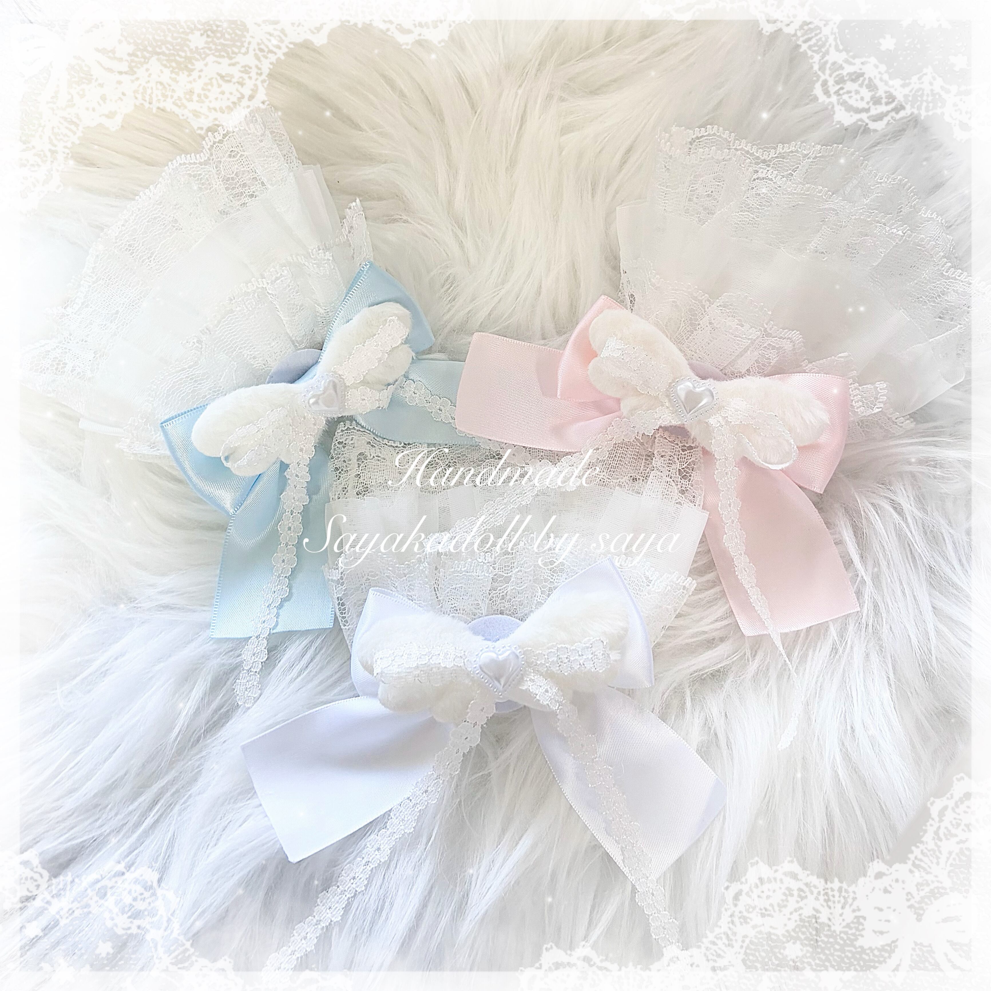 天使のうさぎさん付きヘッドドレスとお揃いデザインのふわふわ可愛い天使のはね付きお袖留めになります୨୧