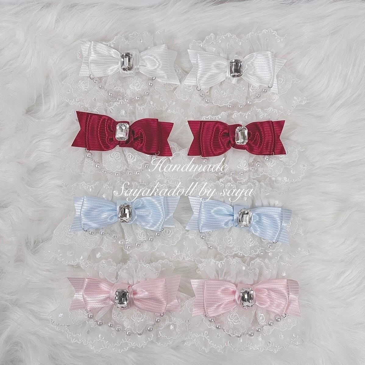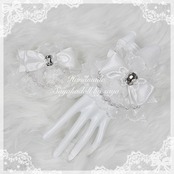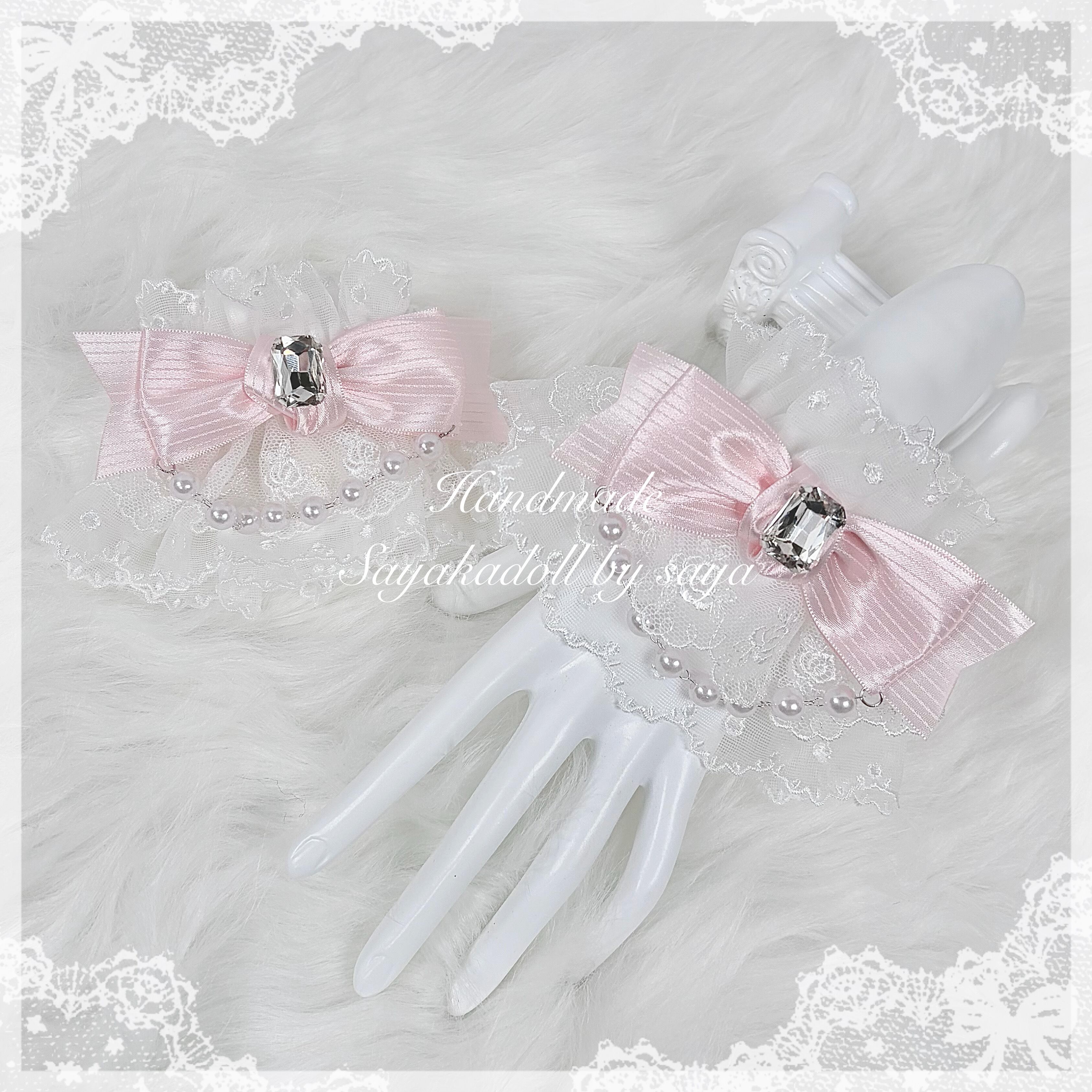 ♡【受注生産】No.2 クリスタルビジュー パールチェーン付き ストライプ柄サテンリボン お袖留め/カフス white《全4色》♡