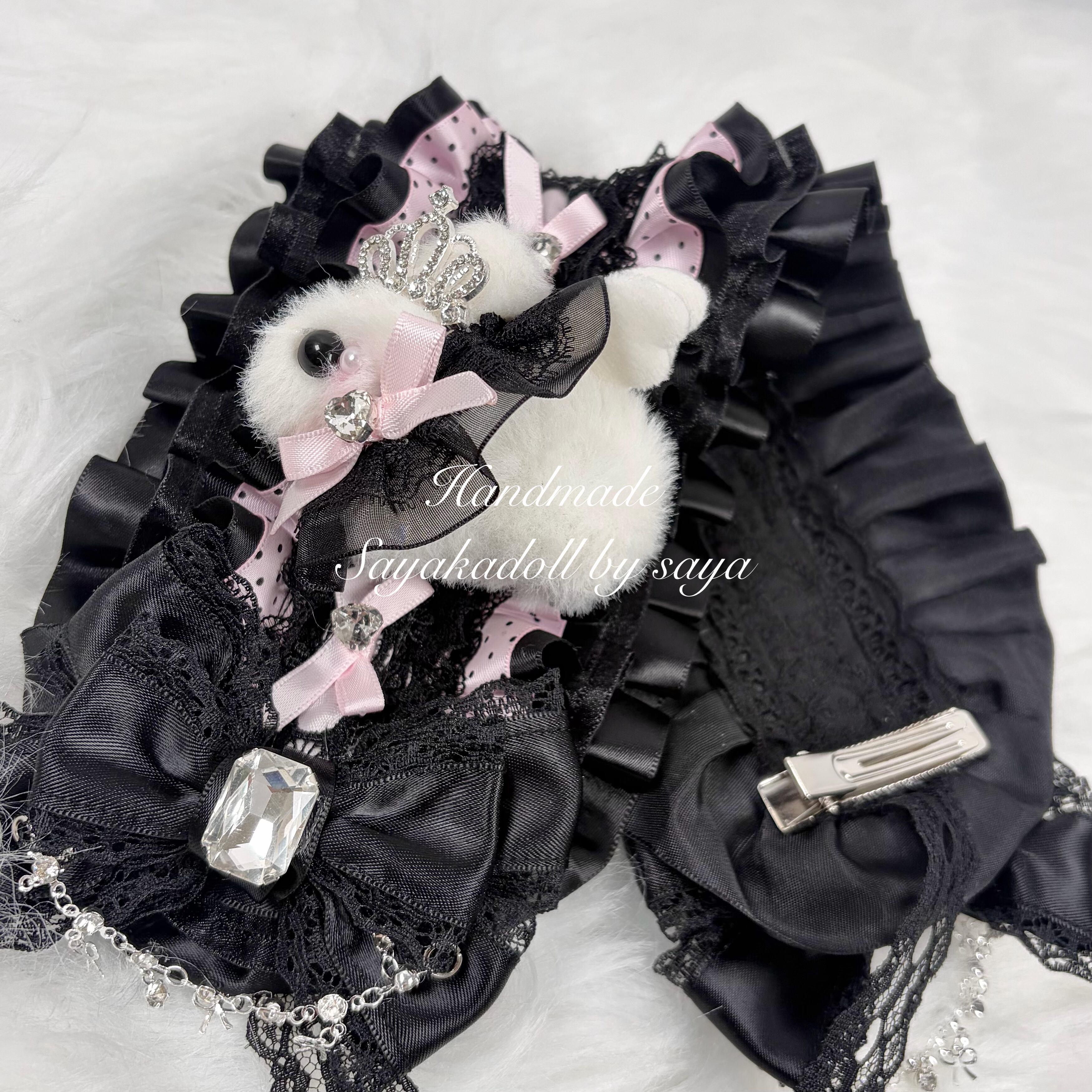 ♡【受注生産】No.5 きらめくティアラの天使のうさぎさん付き ドット柄フリル クリスタルドロップ 大人かわいい姫系リボンヘッドドレス black×pink ♡