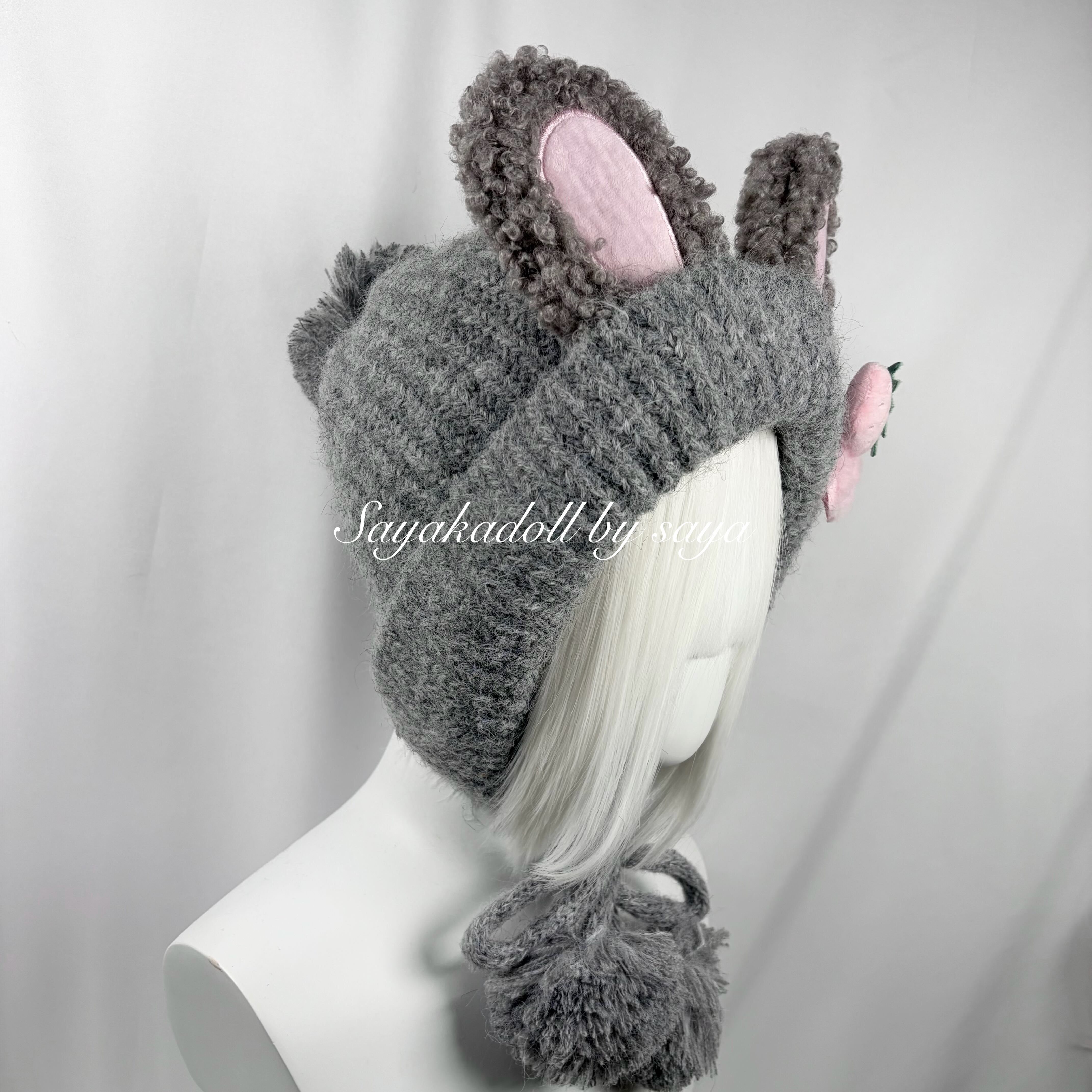 ♡ Strawberry うさみみ もこもこふわふわニット帽 ビーニー gray ♡
