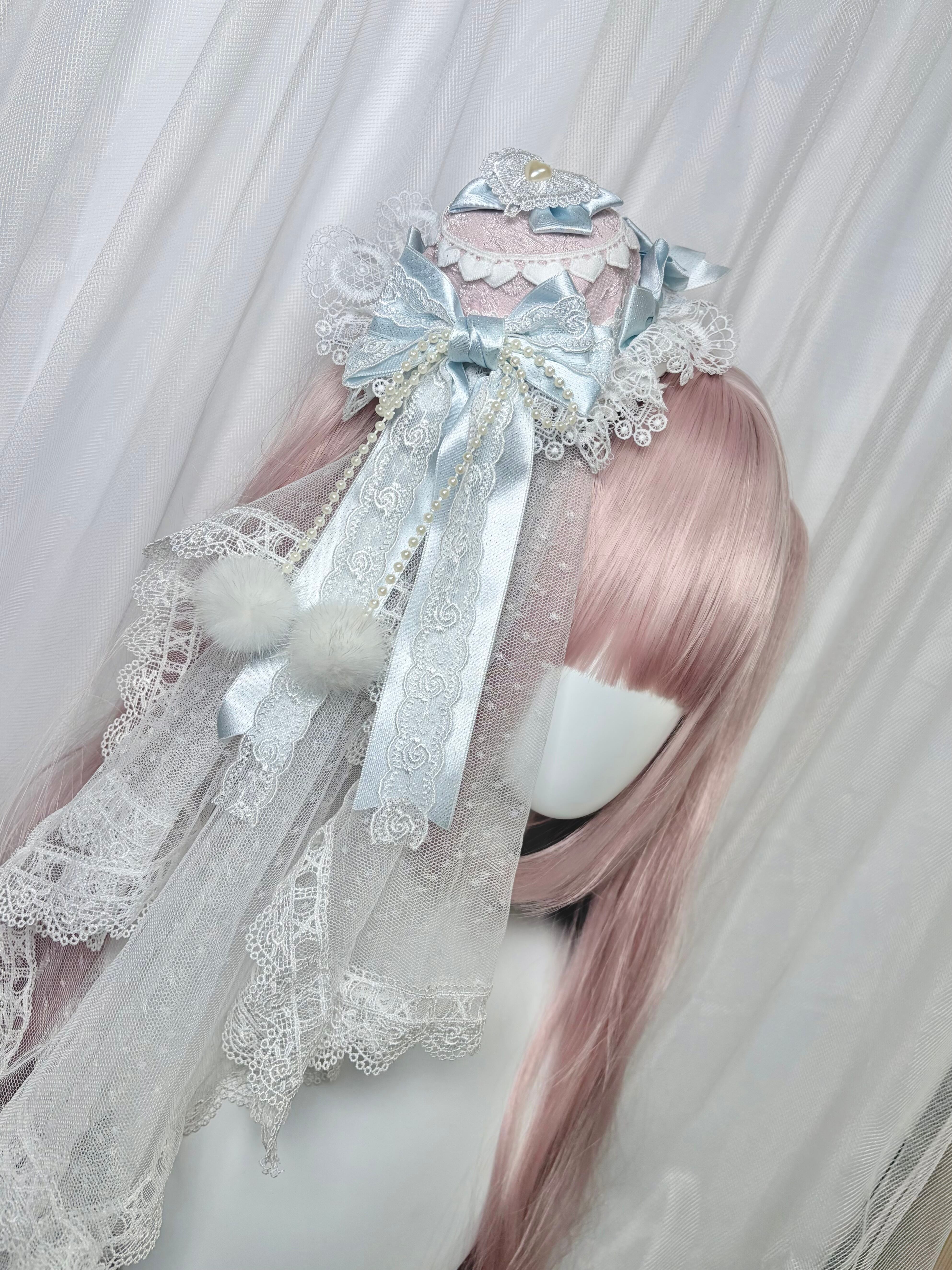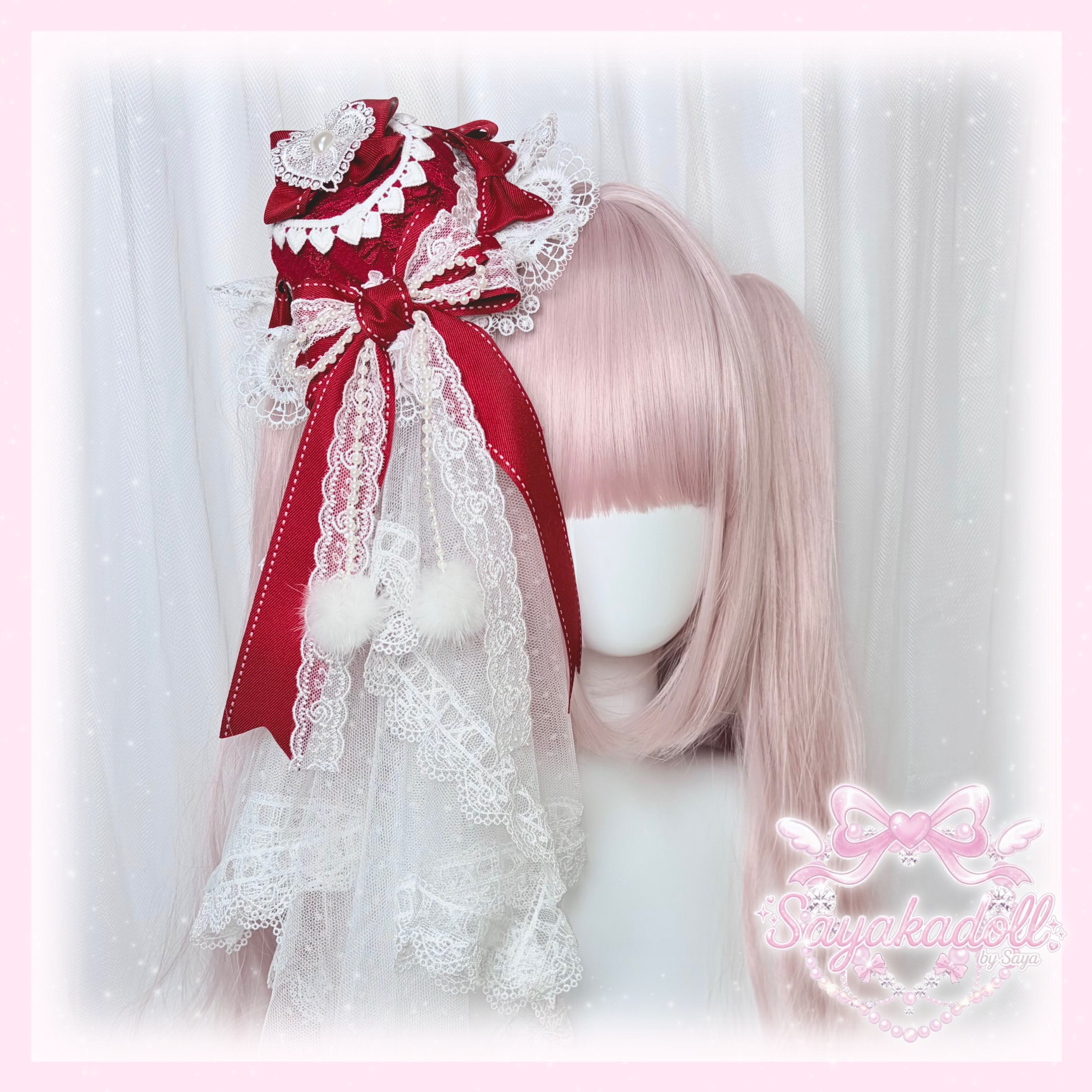 ♡【全6色】マシュマロぽんぽんリボン ロリィタミニハットヘアクリップ+ヴェールセット red ♡