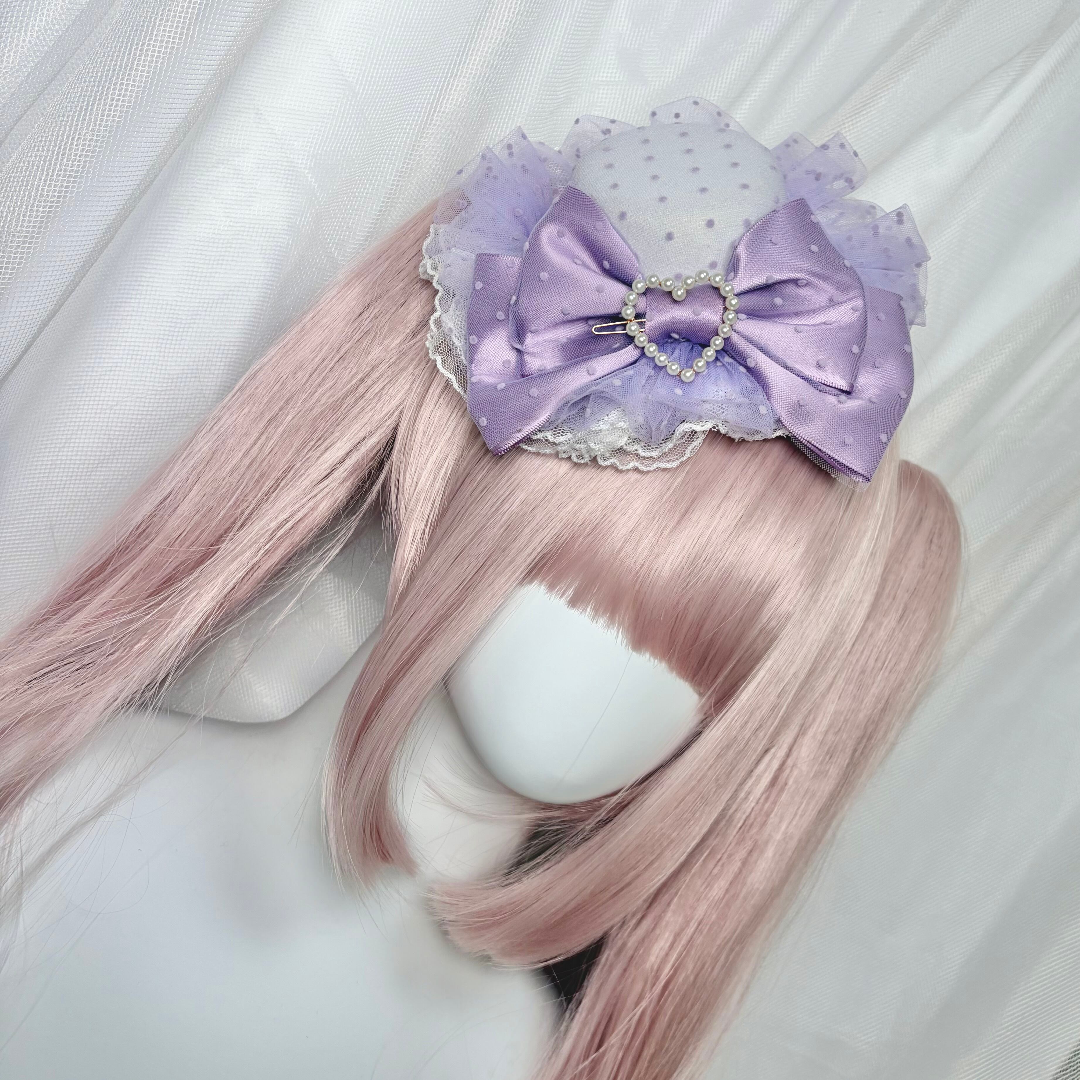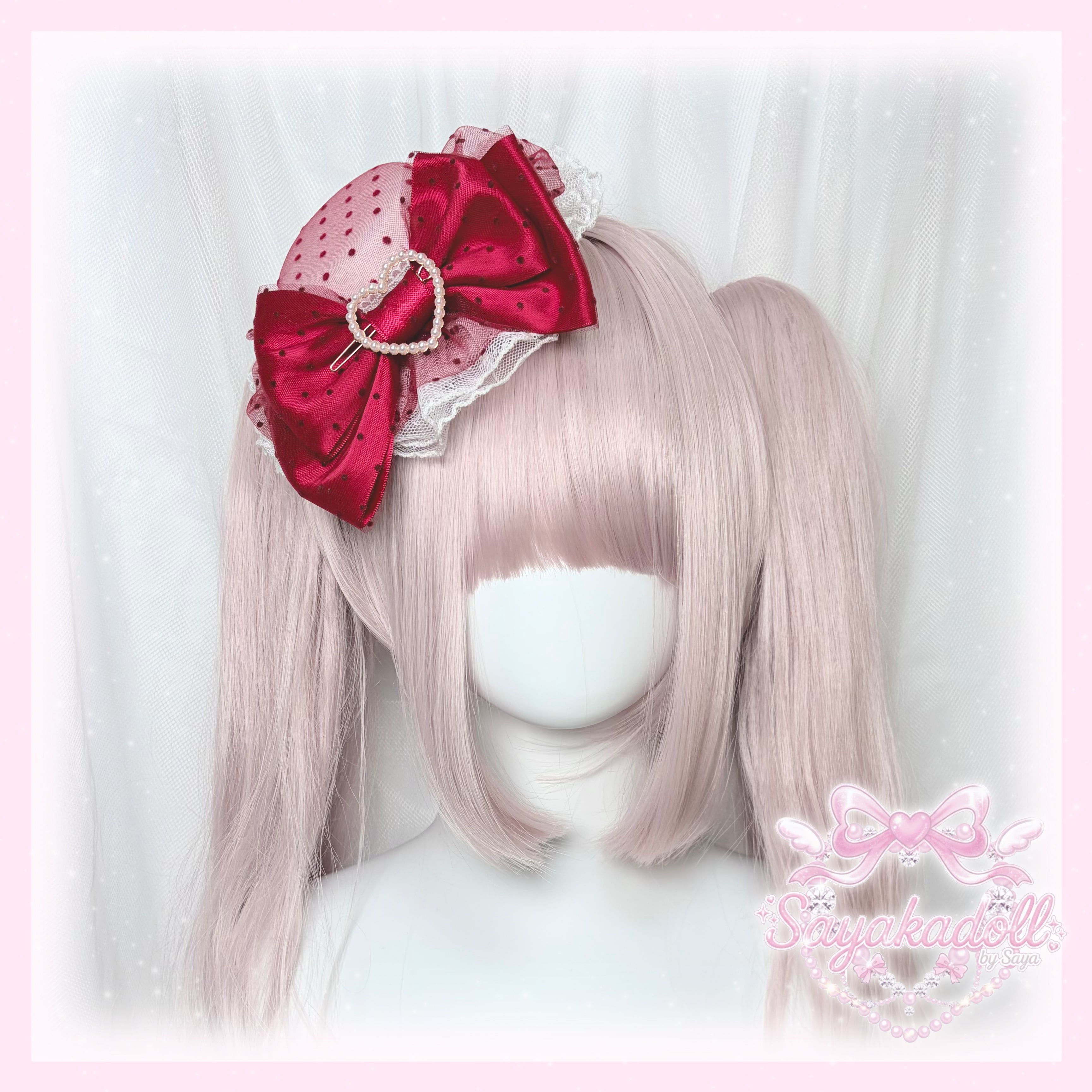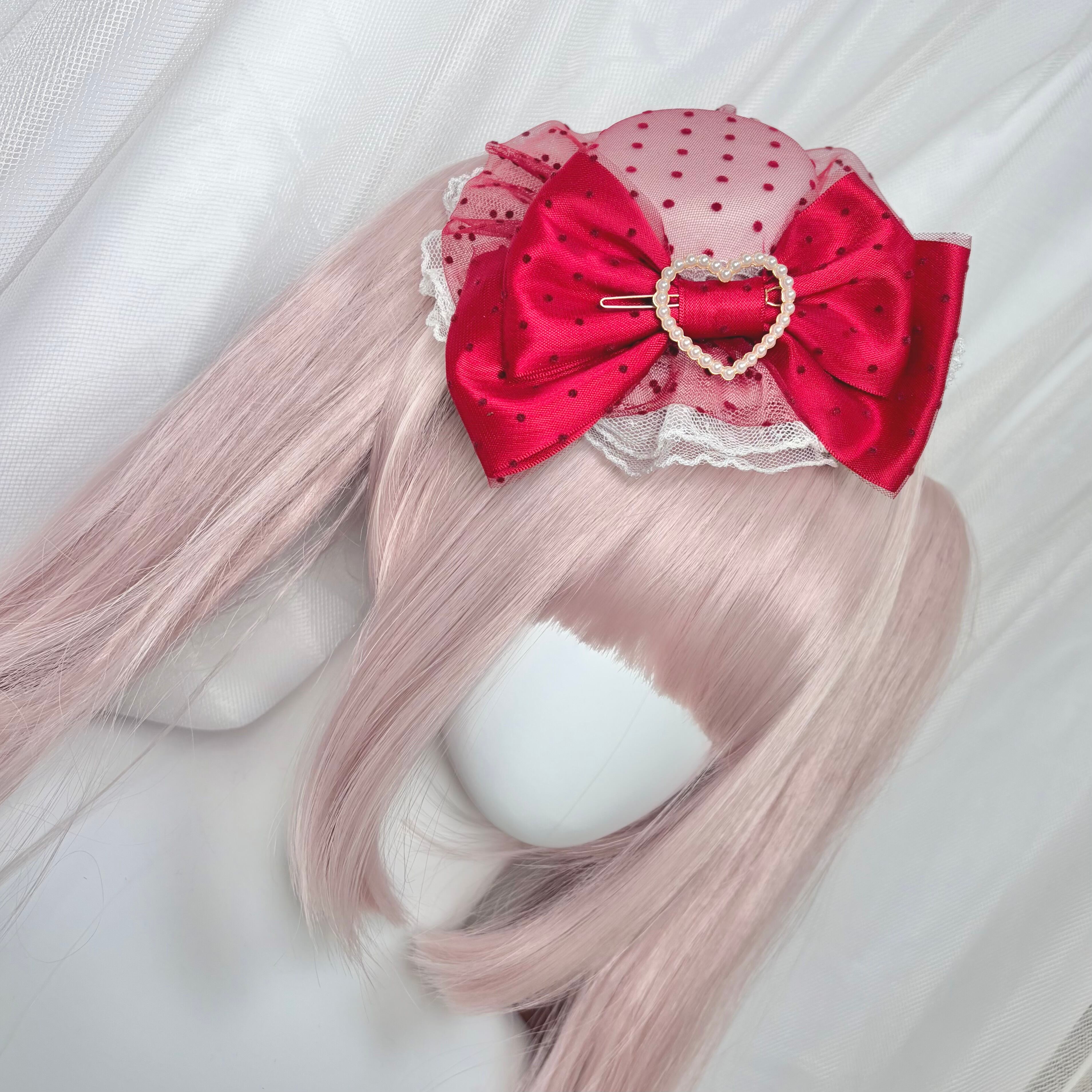 ♡【全4色】ドット柄 チュールリボン パールハートロリィタミニハット red ♡