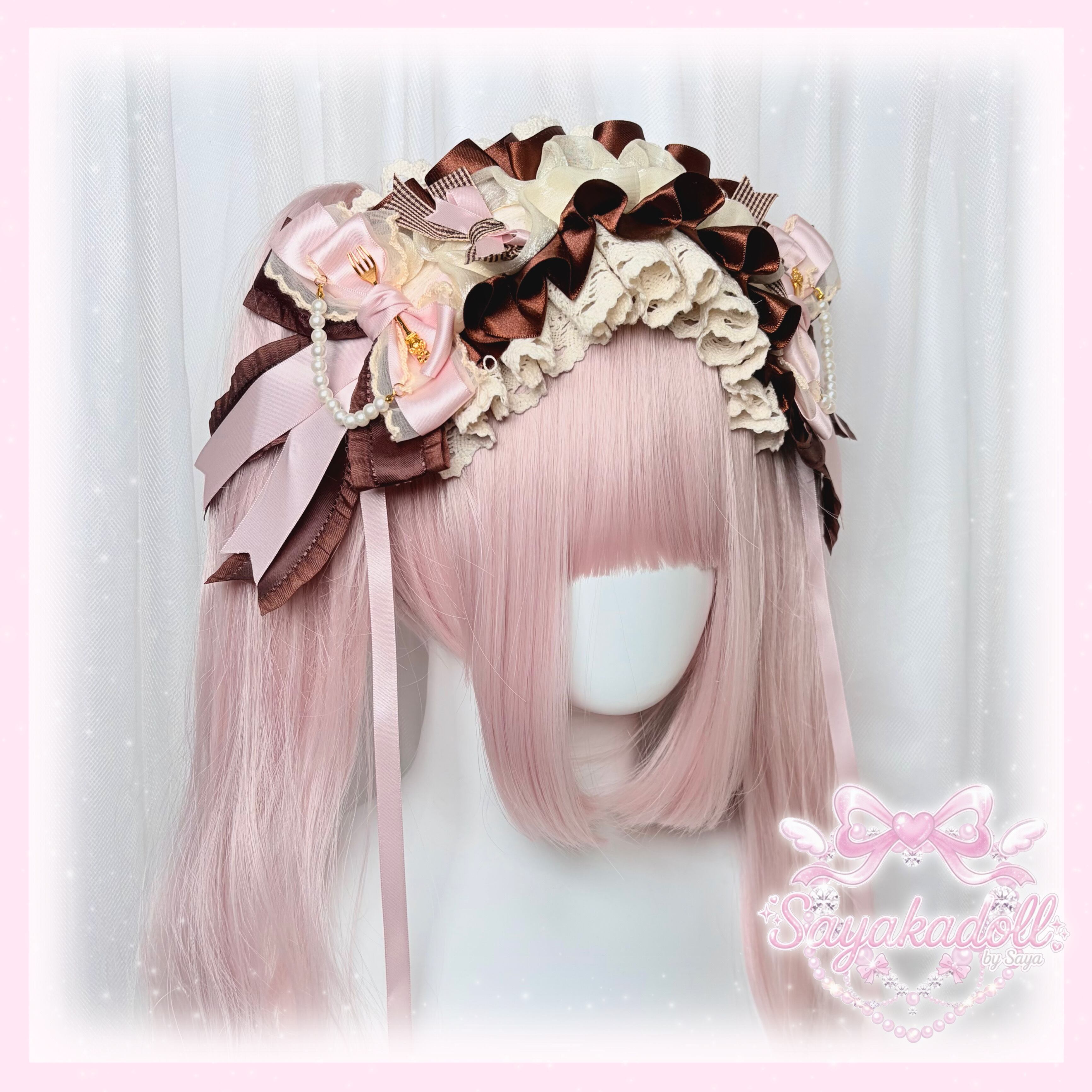 ♡【全3色】プリンチョコレート パールチェーン&フリルレースリボン お茶会ヘッドドレス ♡