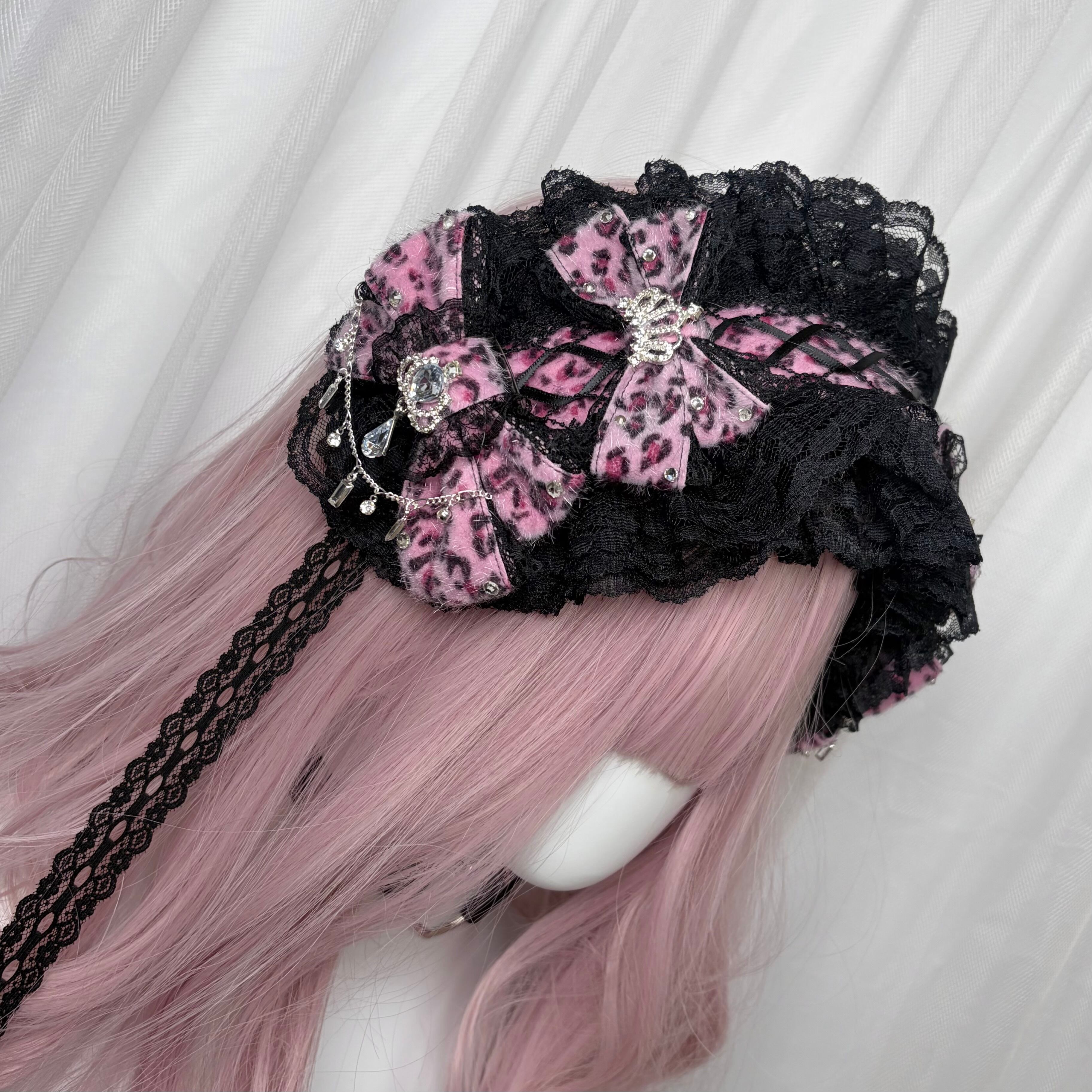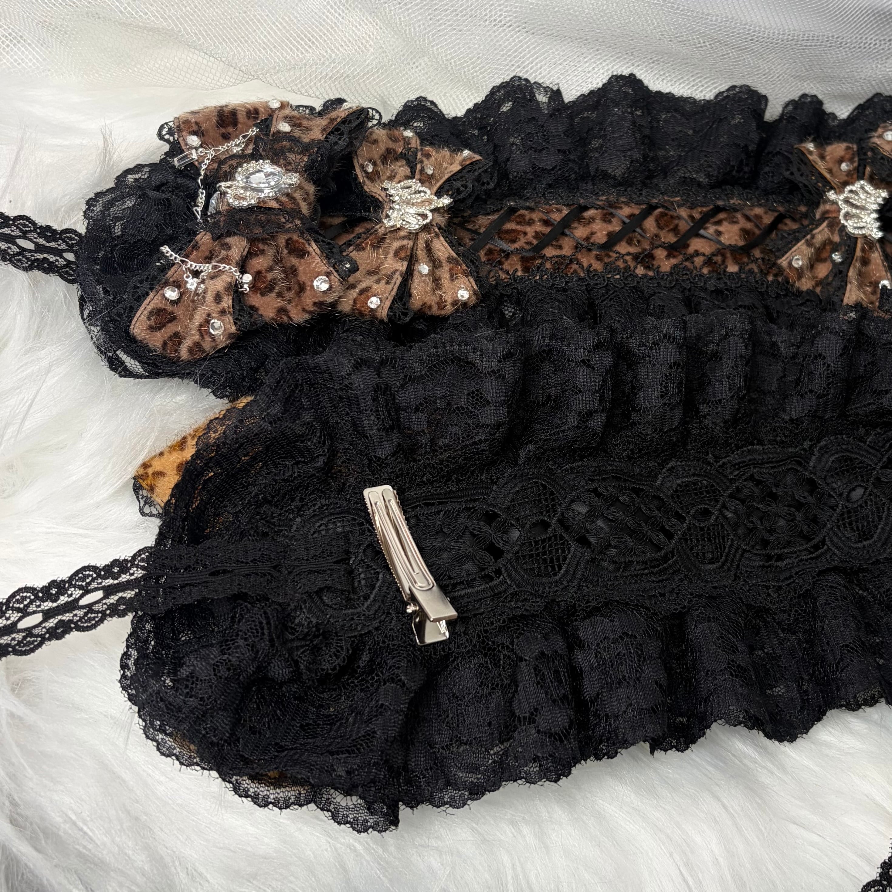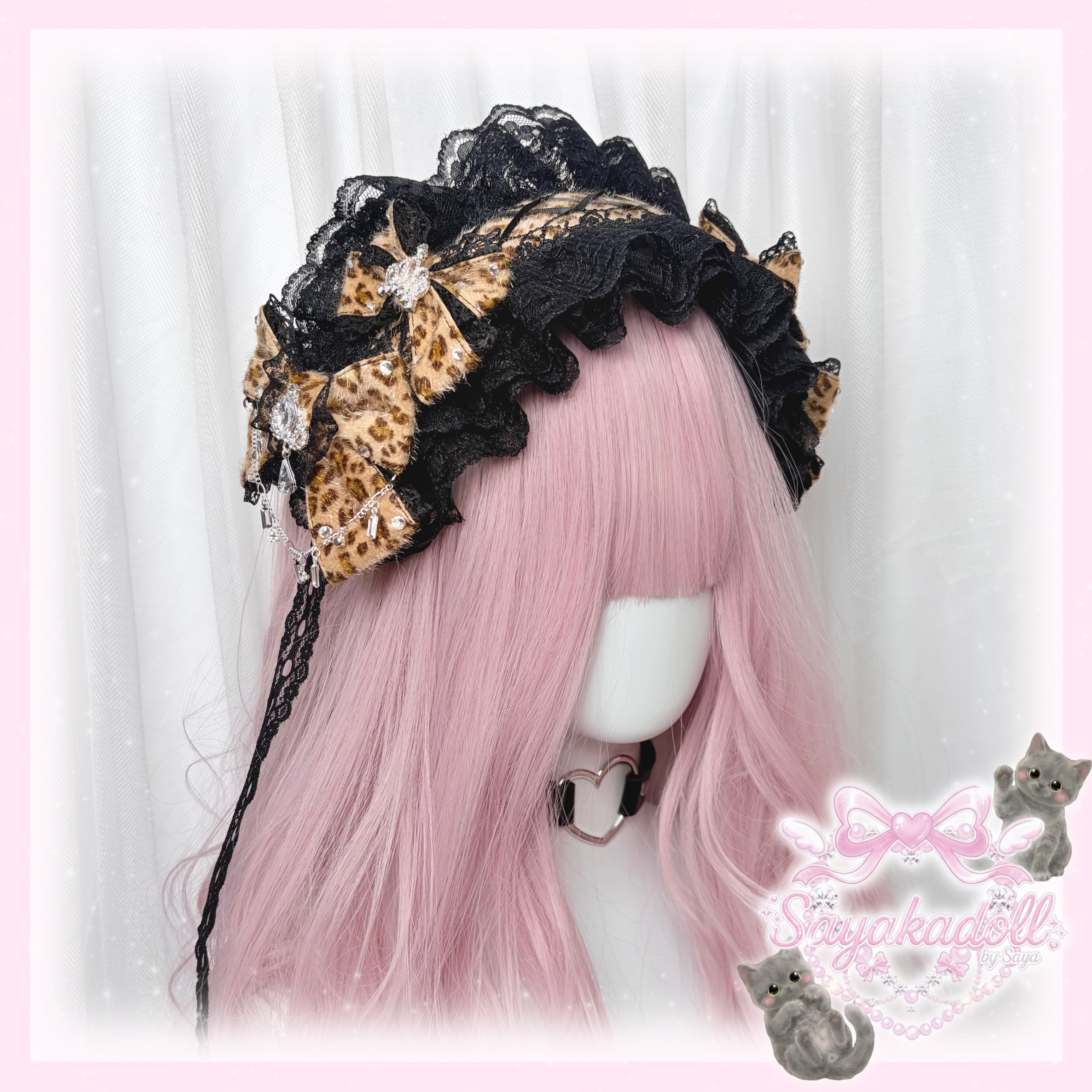 ♡【受注生産】No.9 姫ギャル 小悪魔レオパード ヒョウ柄 ビジューティアラ&編み上げダブルリボン ブラックレースヘッドドレス dark brown ♡
