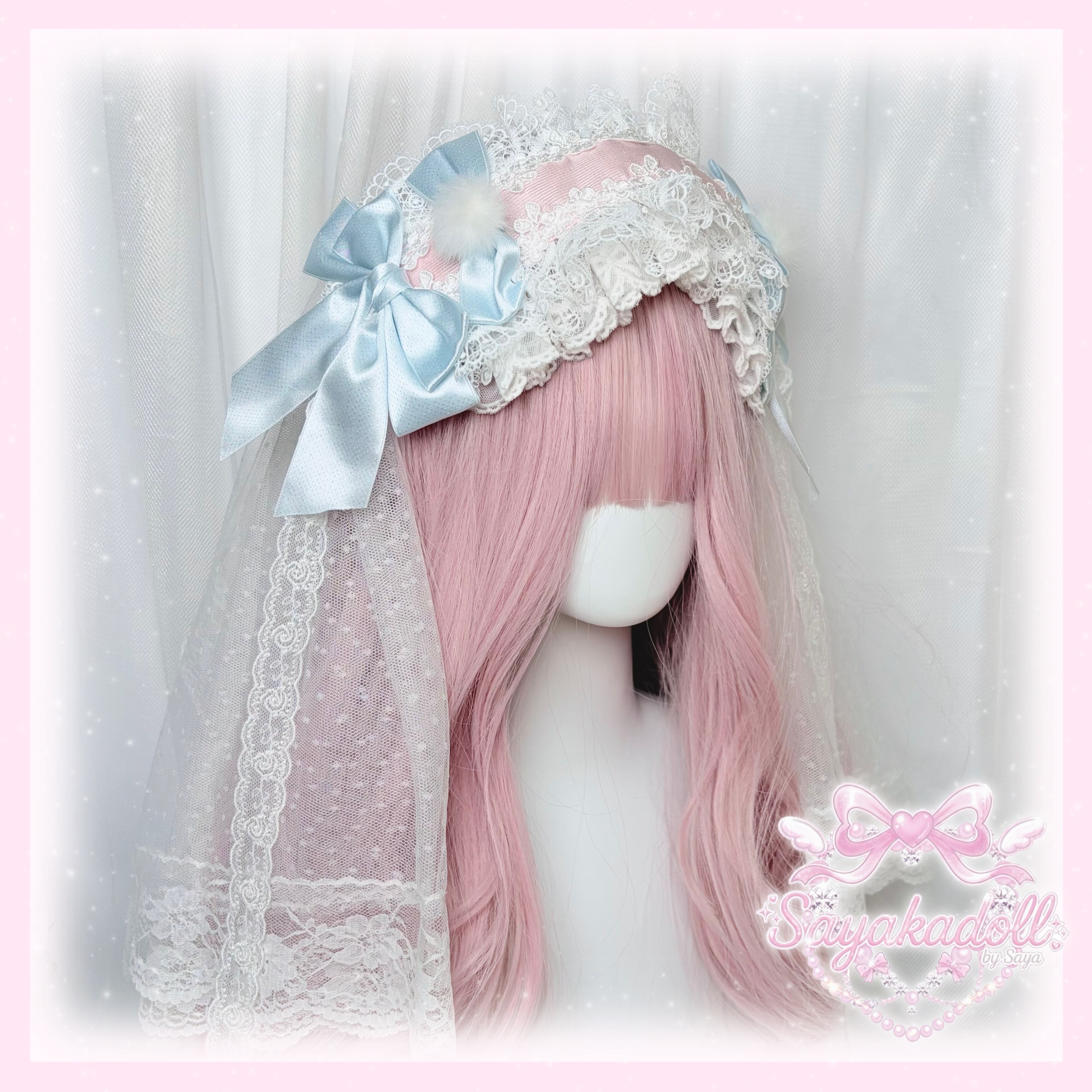 ♡【全5色】ヴェール別売り ぽんぽん付き ダブルリボン フリルレースヘッドドレス light blue ♡