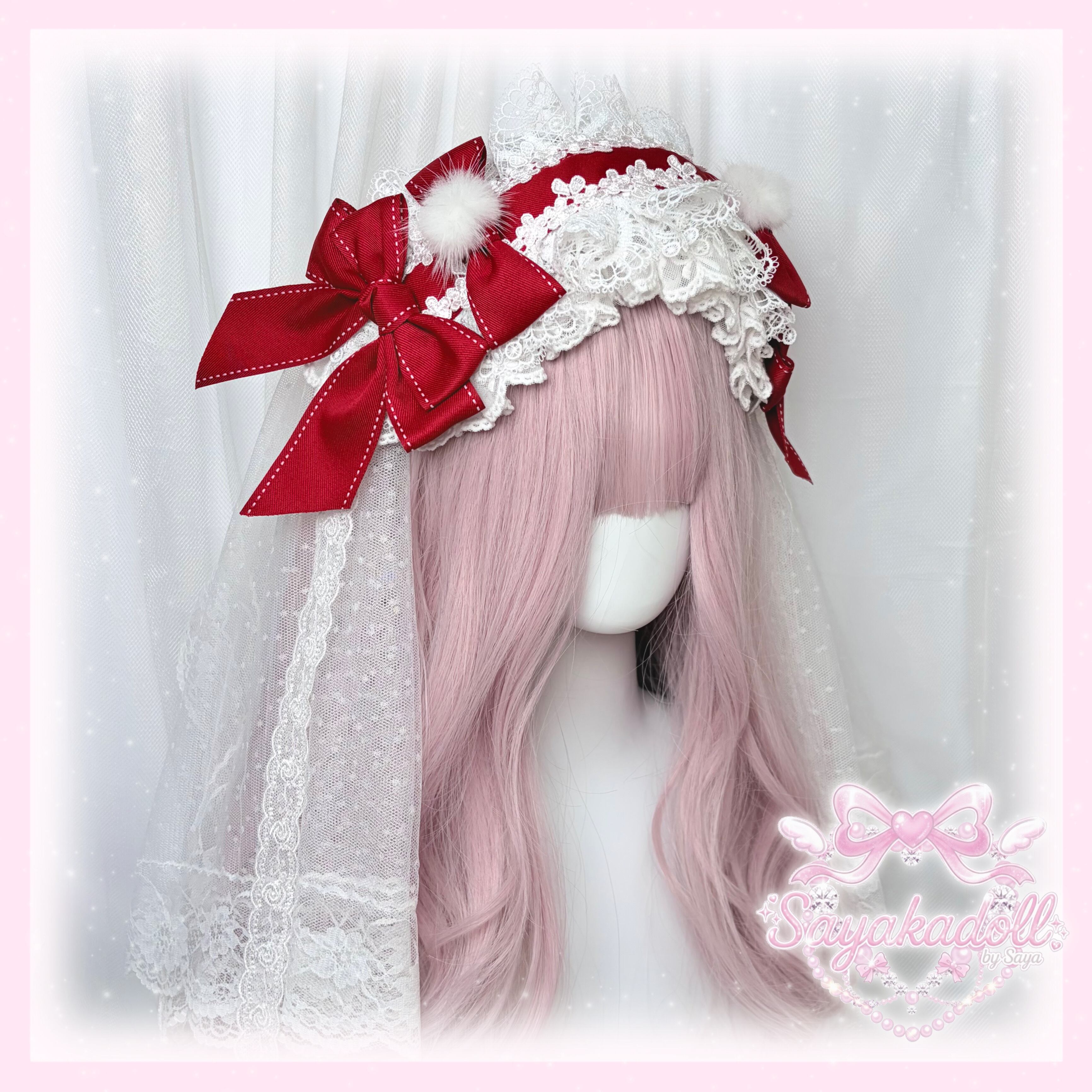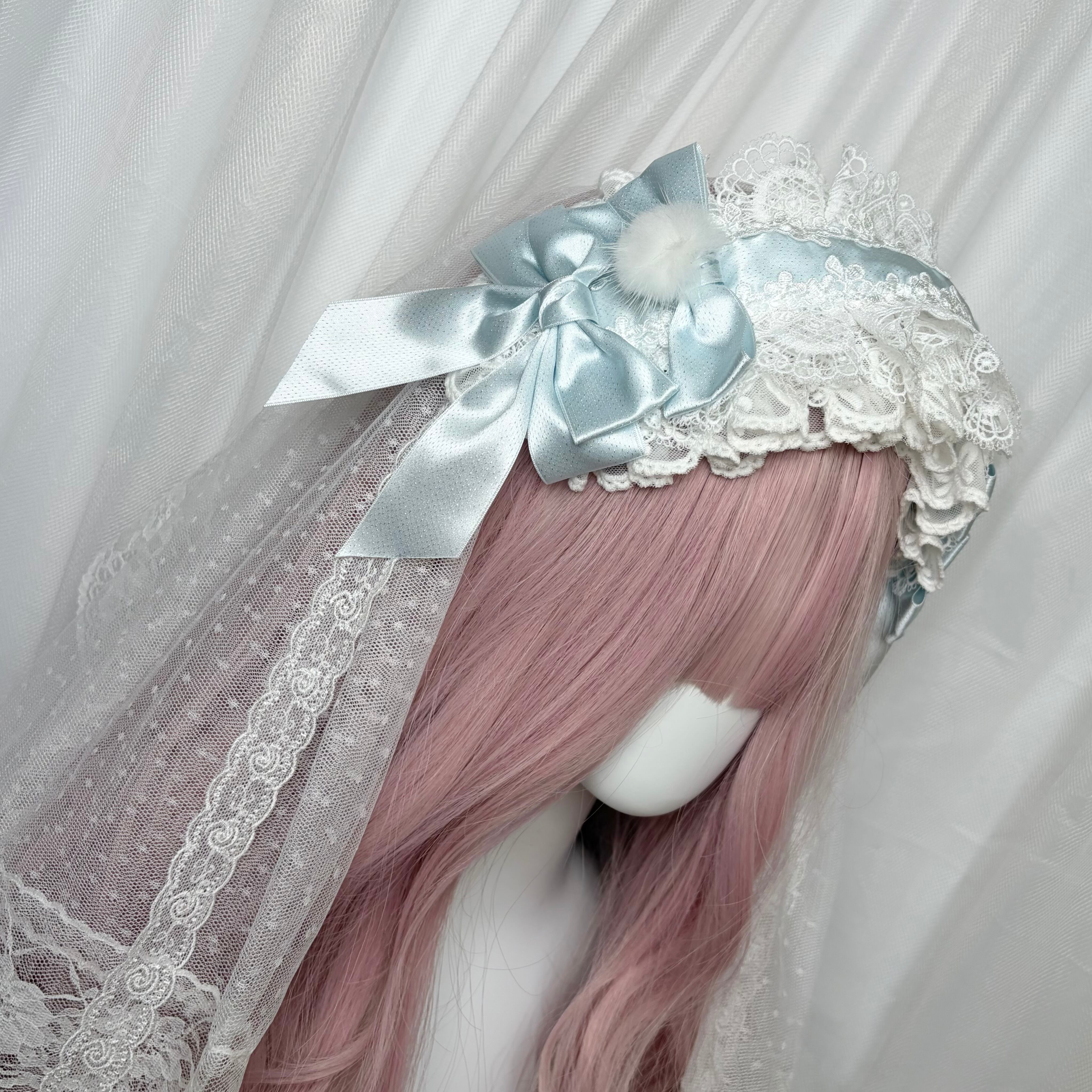 ♡【全5色】ヴェール別売り ぽんぽん付き ダブルリボン フリルレースヘッドドレス pink ♡