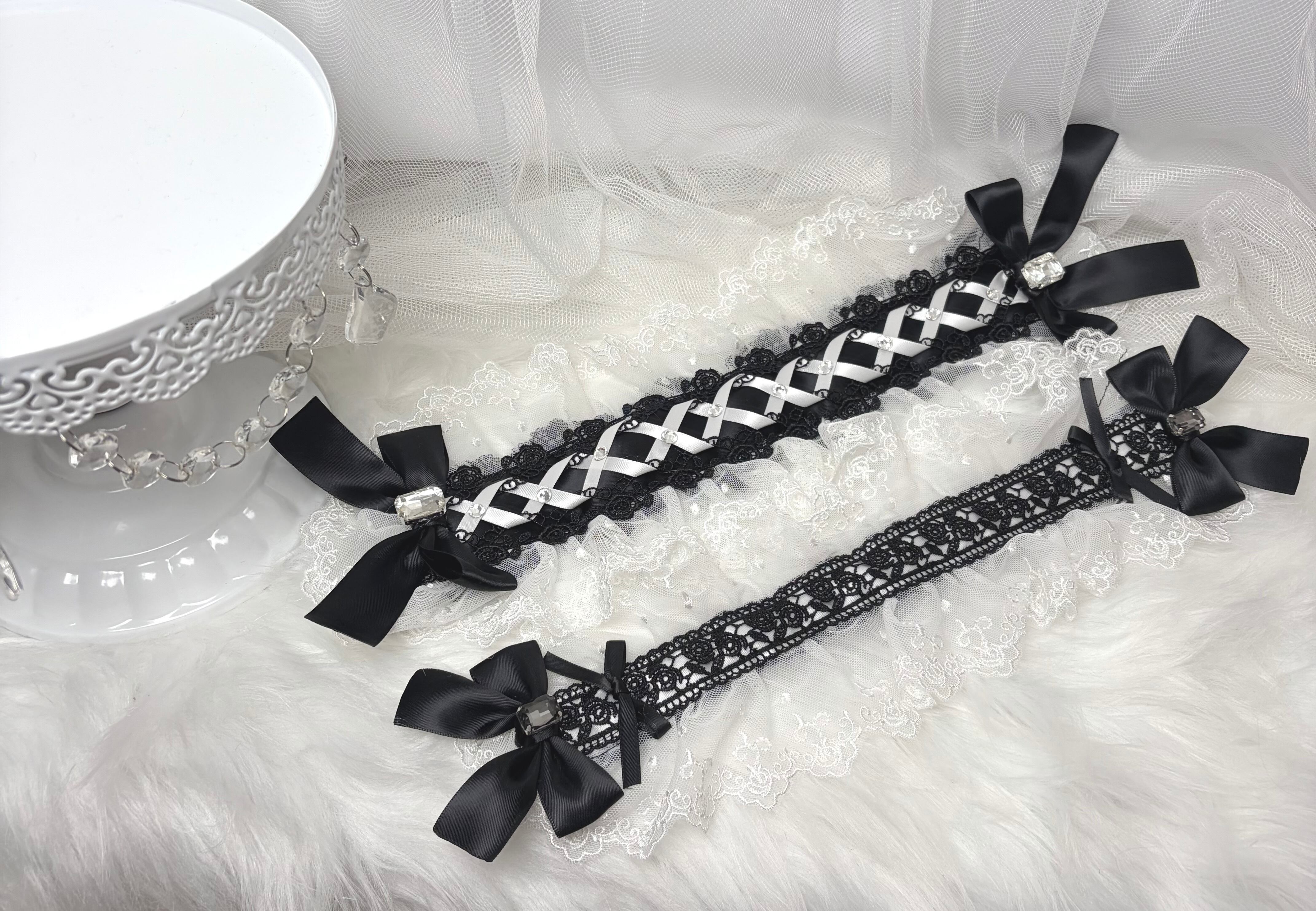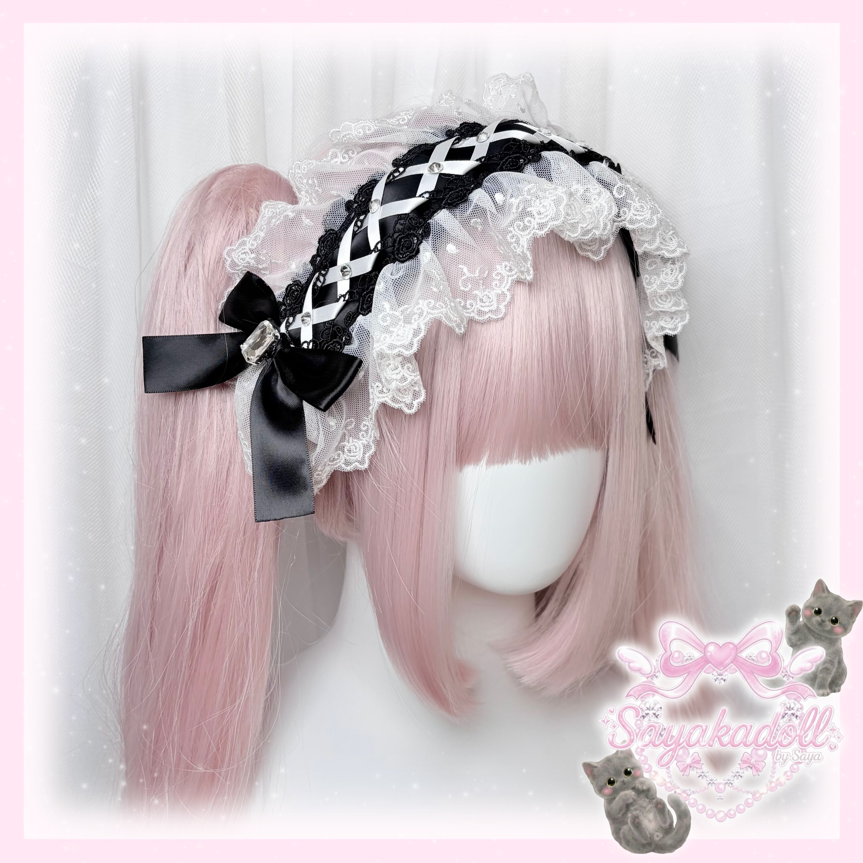 ♡【Sayakadoll by saya Original】一点のみ ホワイトレース 薔薇刺繍 編み上げリボン&クリスタルビジュー フリルリボンヘッドドレス black×white ♡
