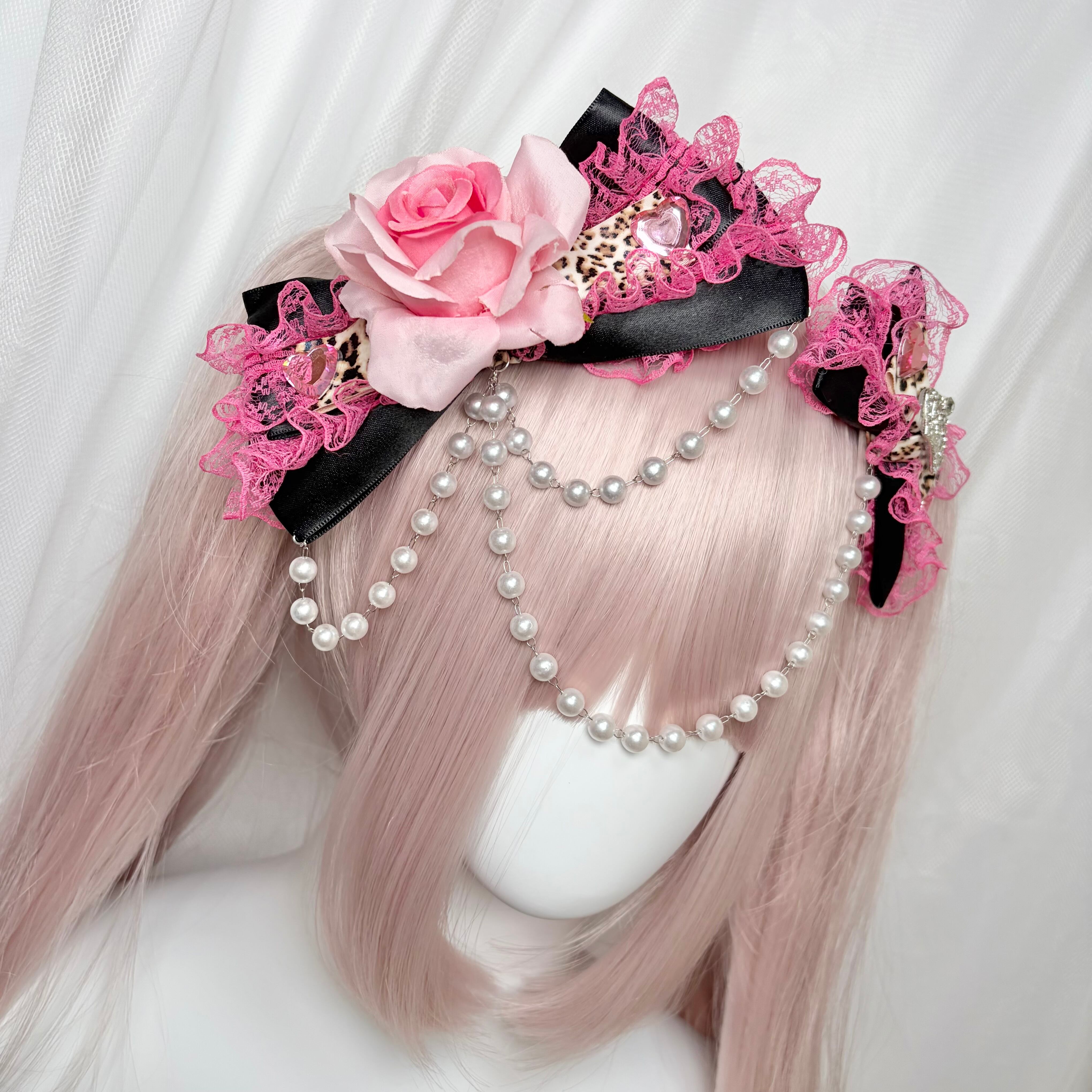 ♡【全5色】姫GAL 薔薇付き パールチェーンフリルリボンヘアクリップ pink ♡