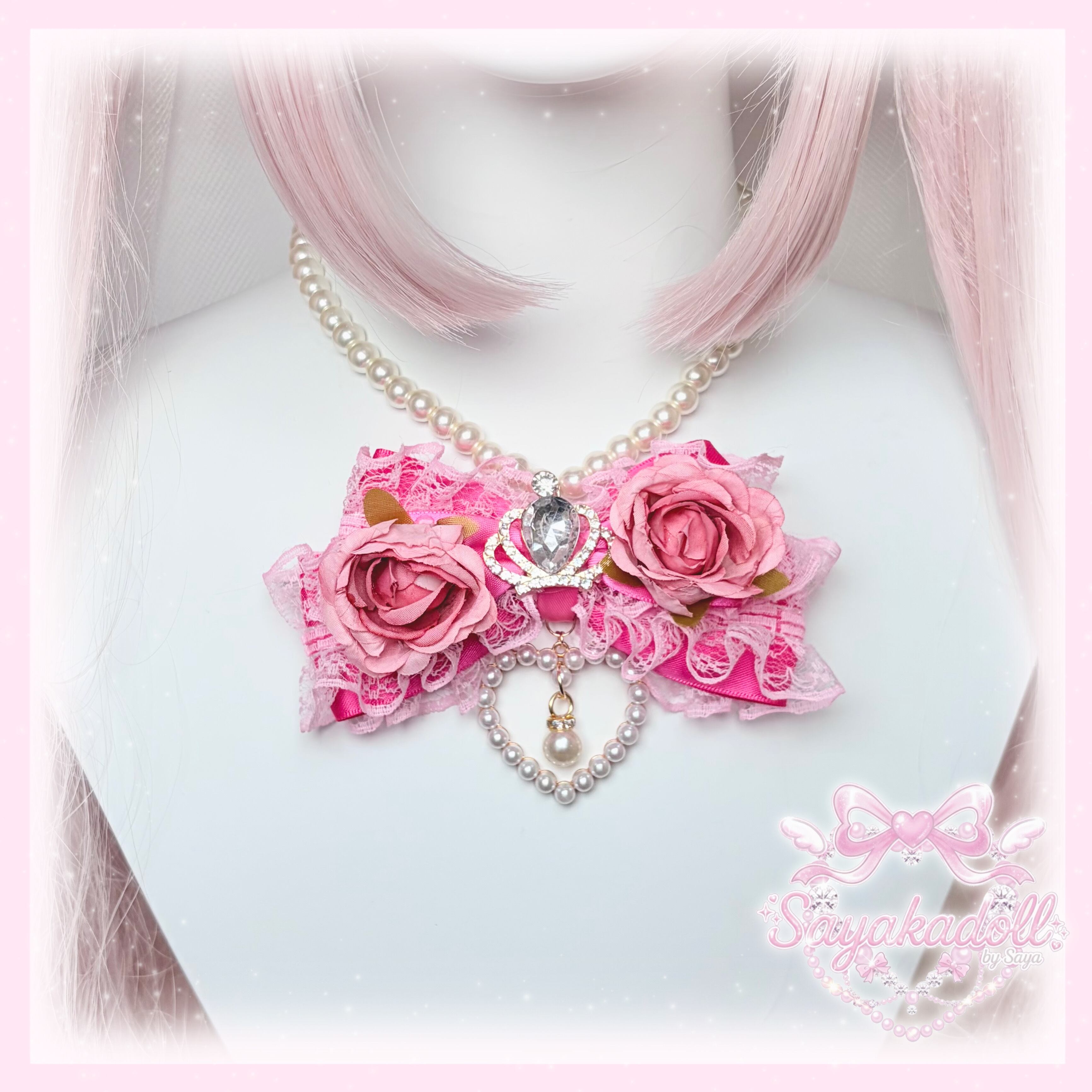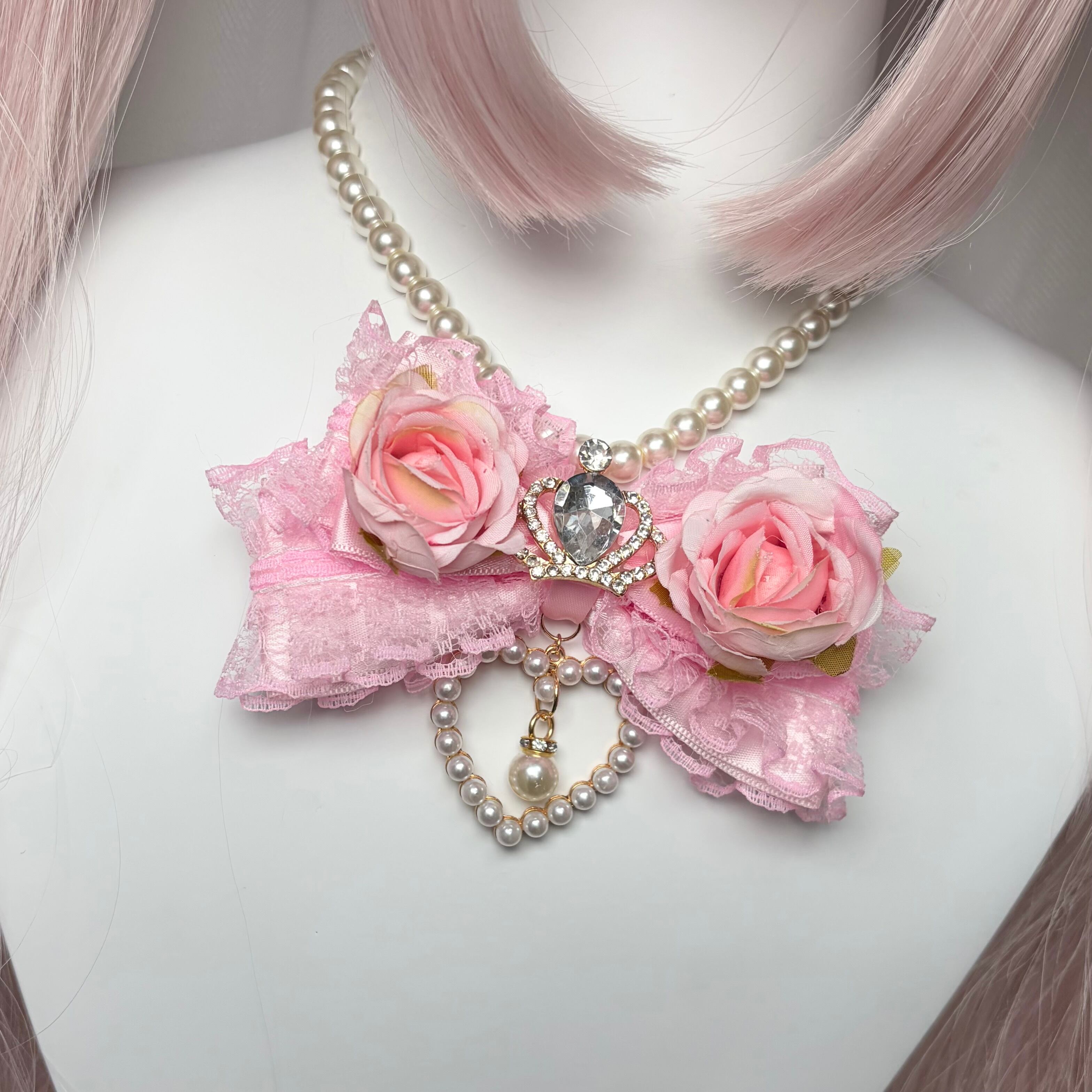 ♡【全2色】姫GAL 薔薇付き クリスタルビジューティアラ&パールドロップ フリルリボンネックレス pink ♡