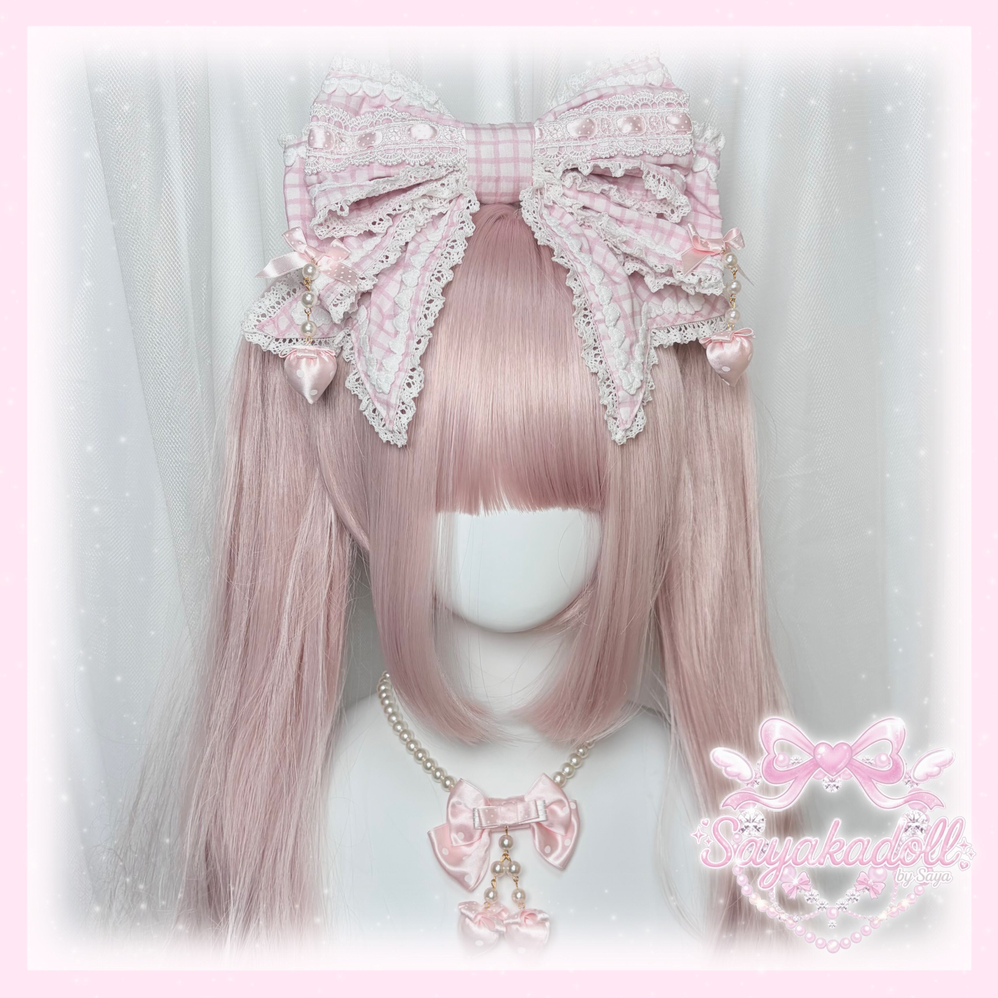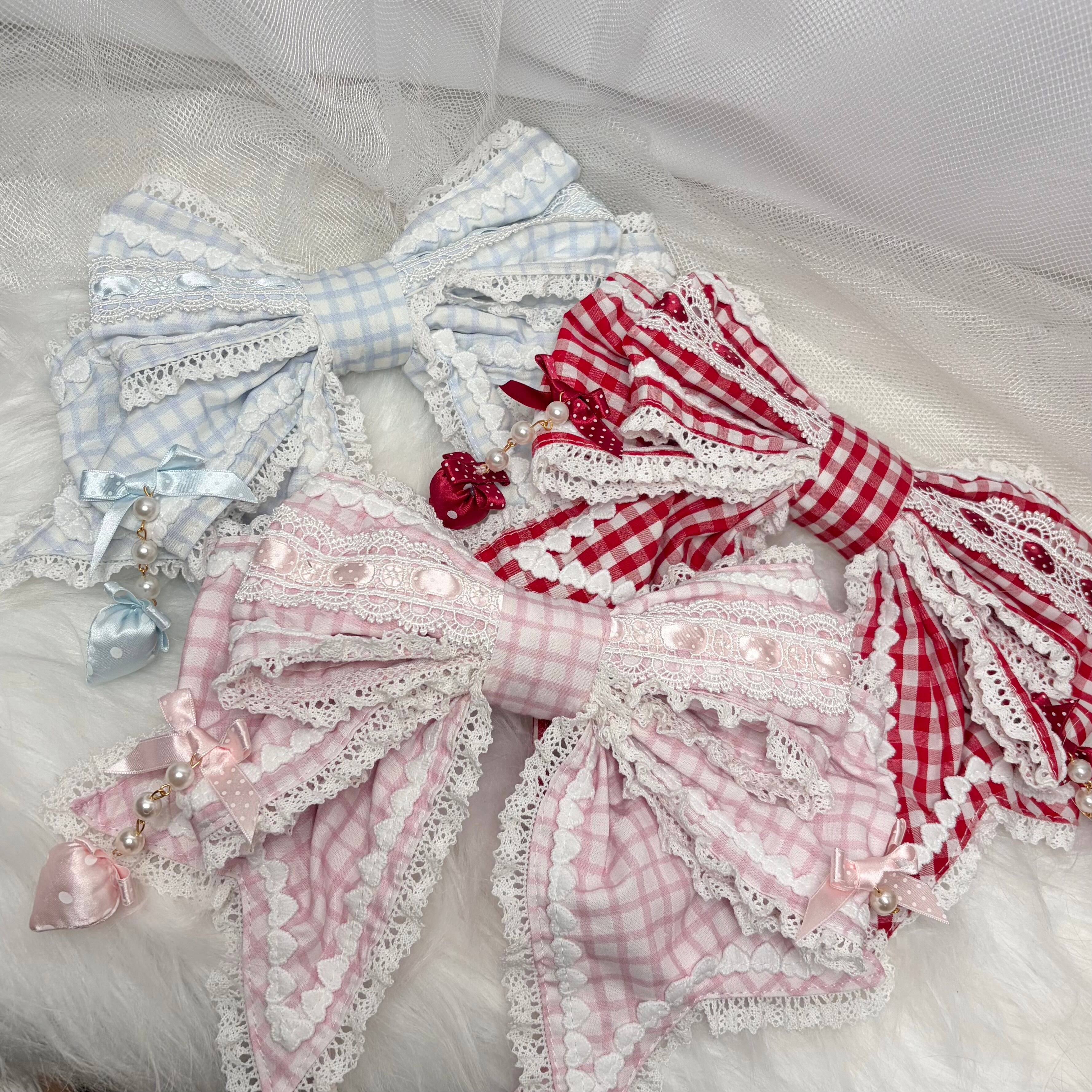 ♡【全3色】MAID Strawberry ギンガムチェック ドット柄リボンフリルカチューシャ light blue ♡