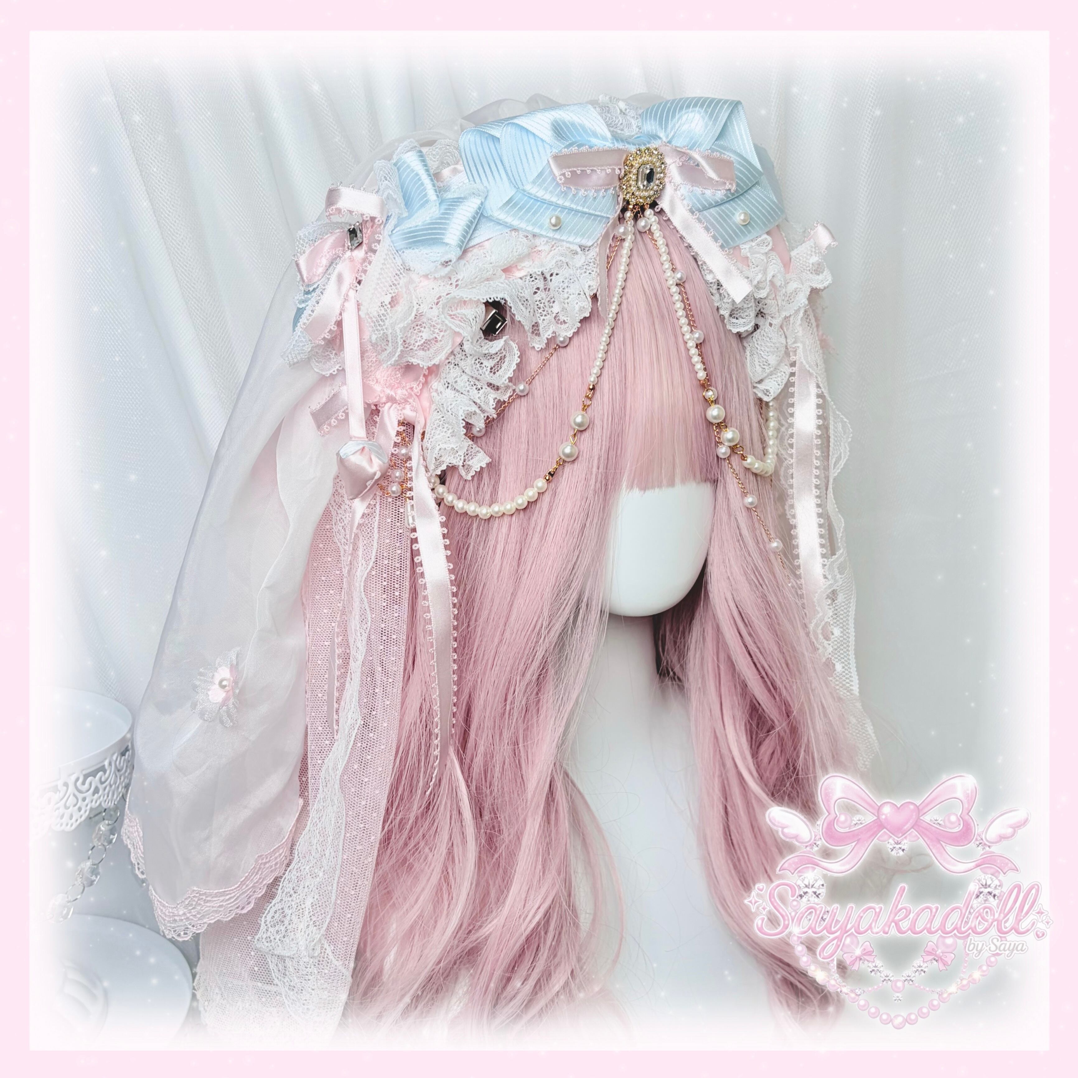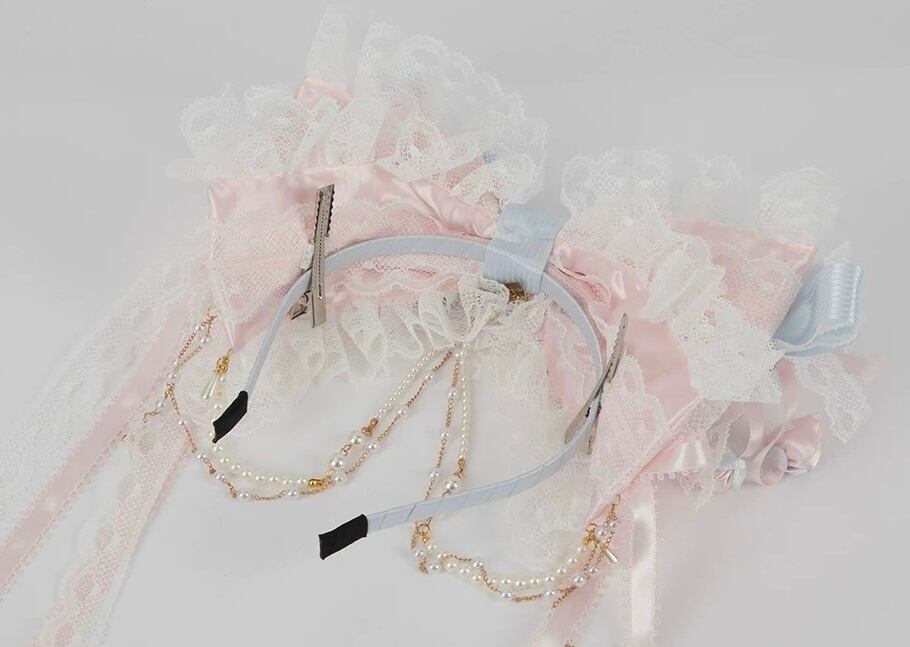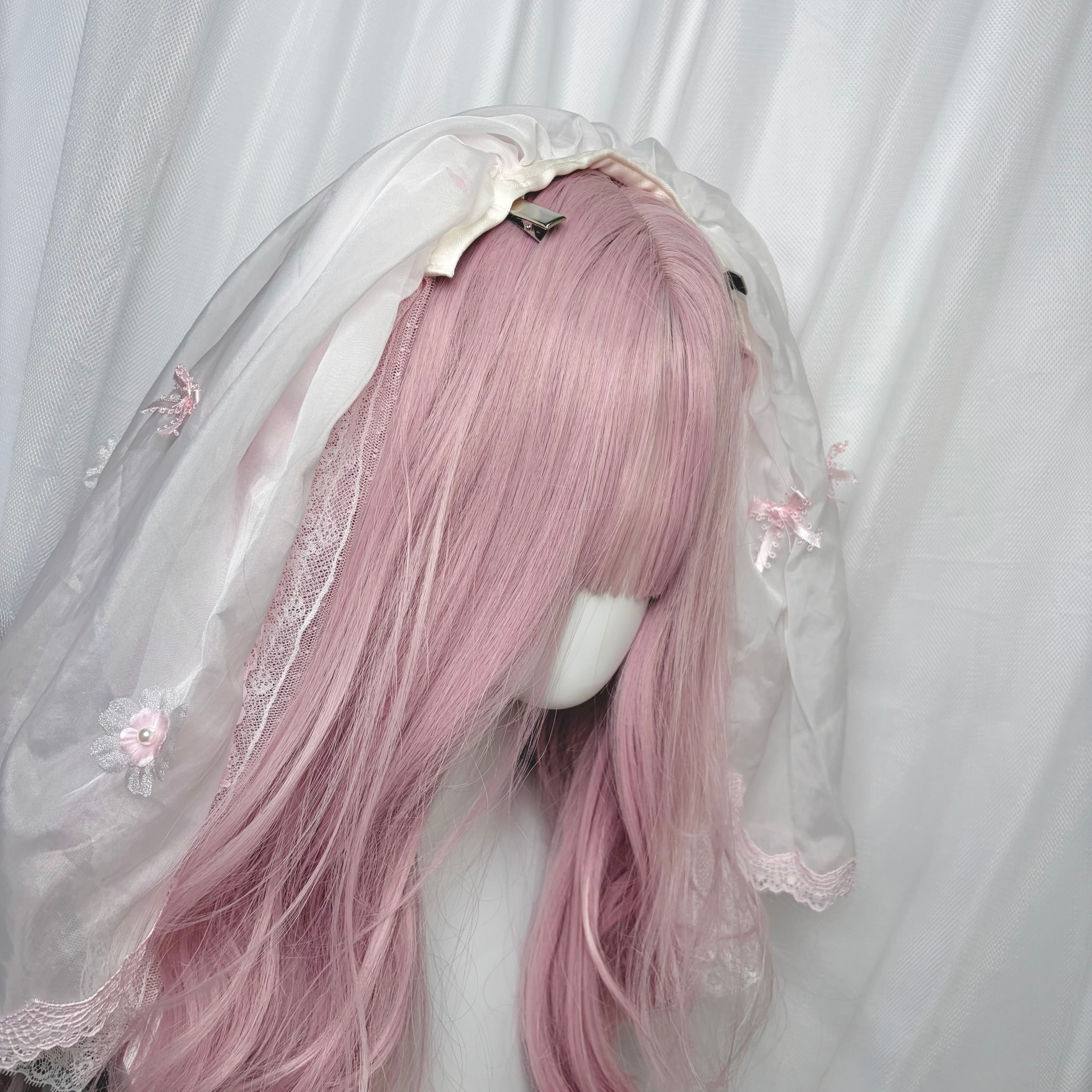 ♡【全2色】Cherry blossom ヴェール付き パールチェーン フリルリボンカチューシャ pink ♡