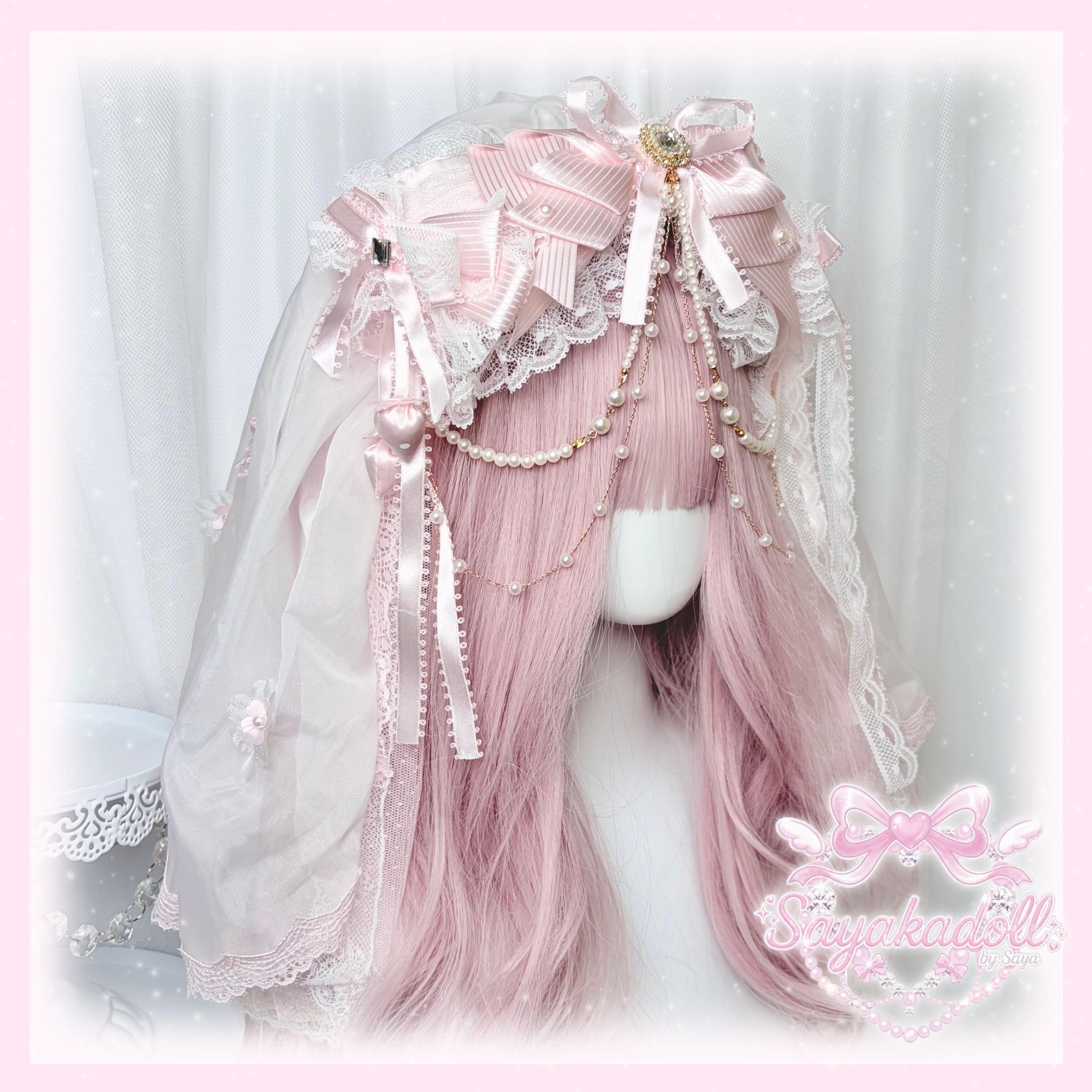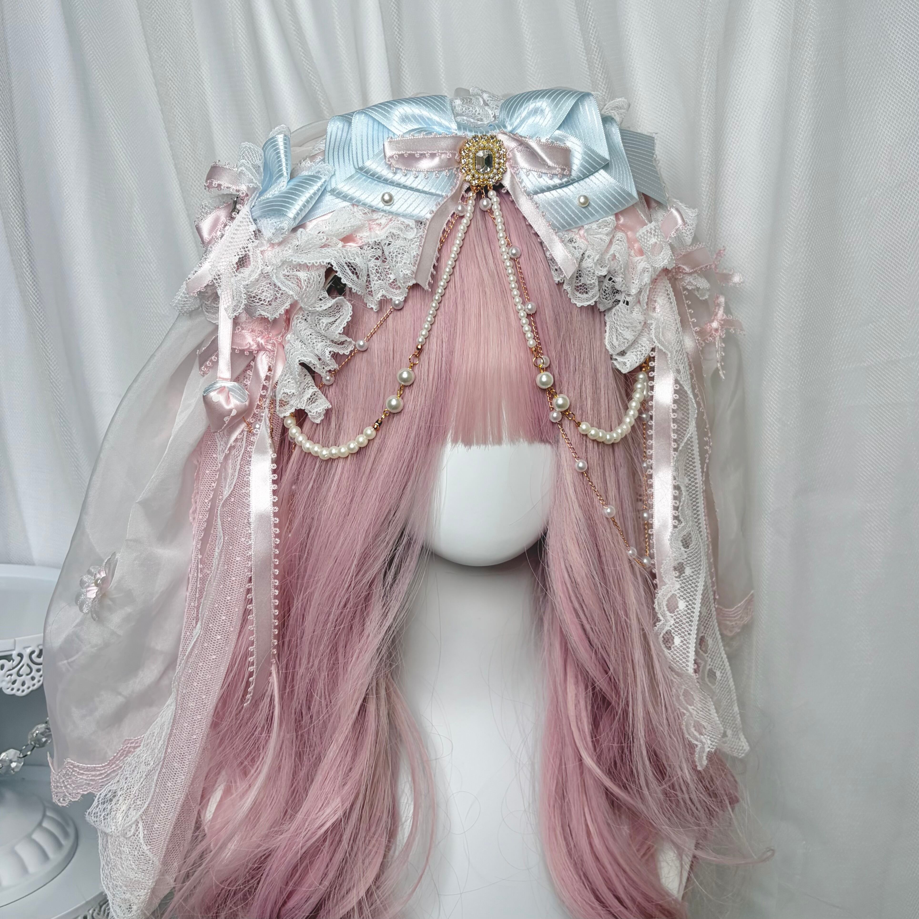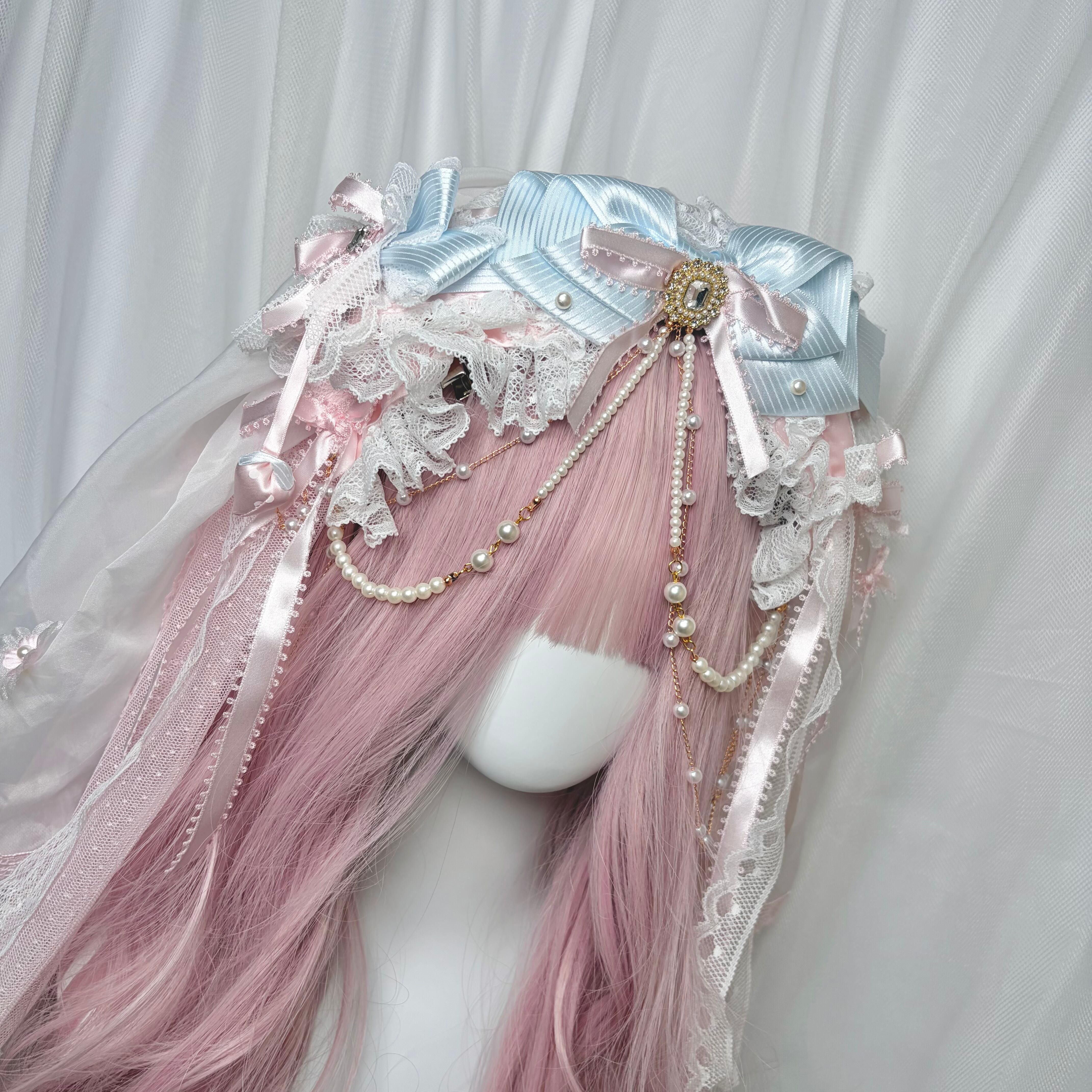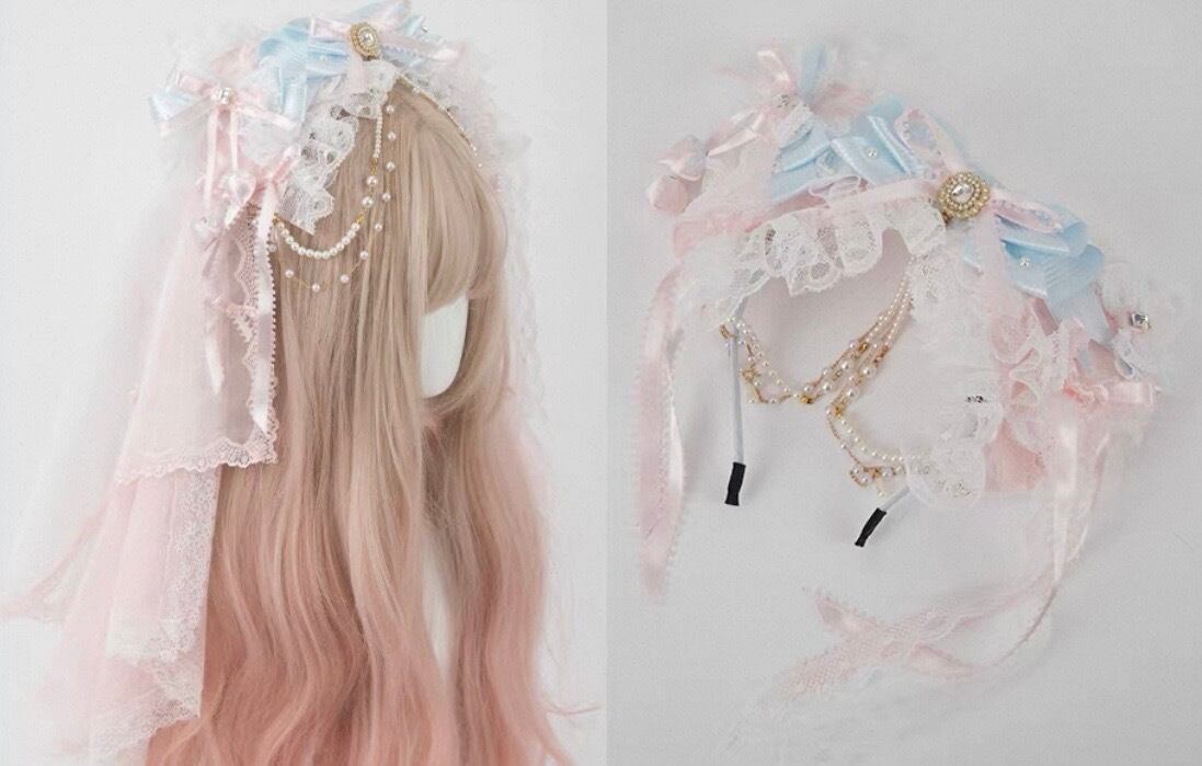 ♡【全2色】Cherry blossom ヴェール付き パールチェーン フリルリボンカチューシャ light blue×pink ♡