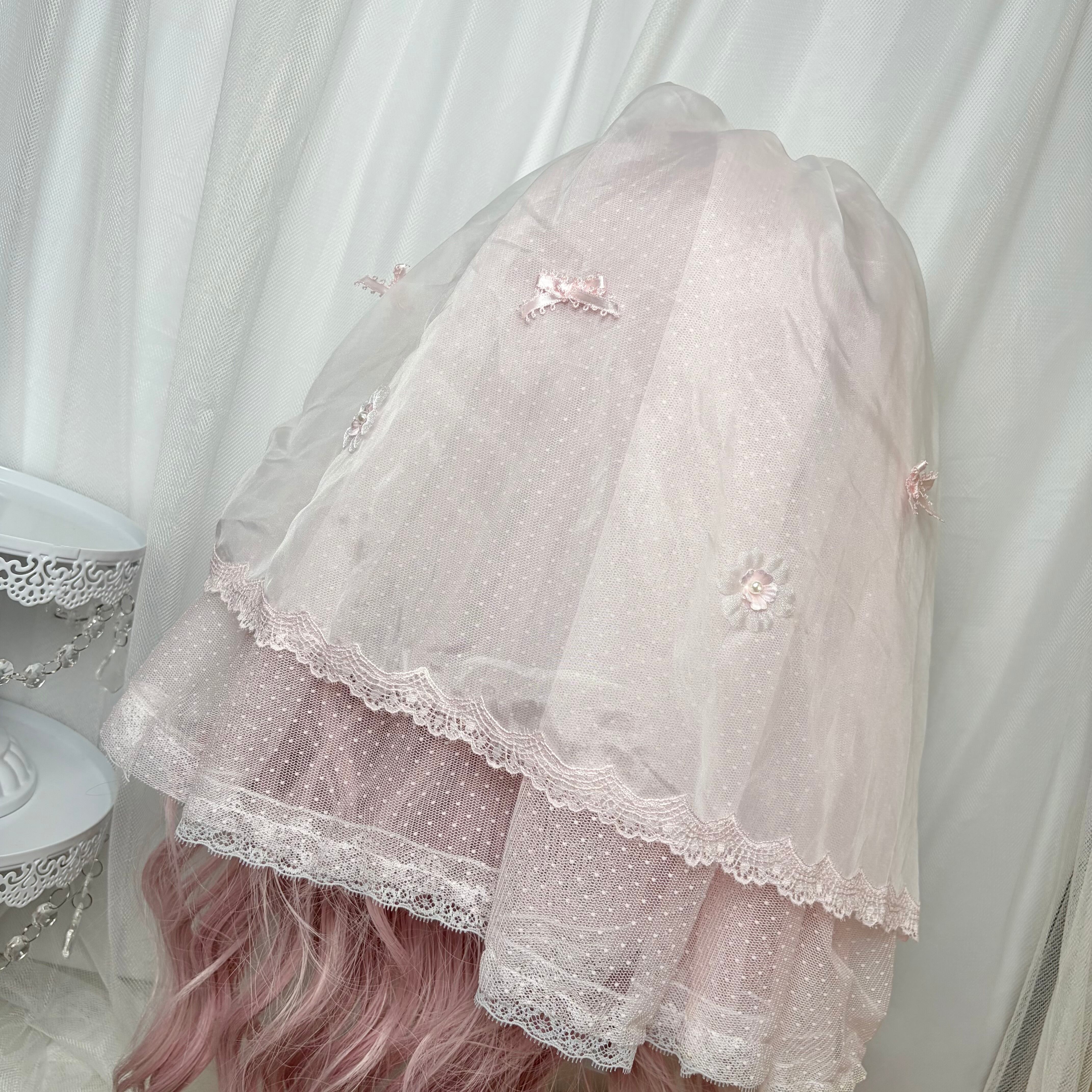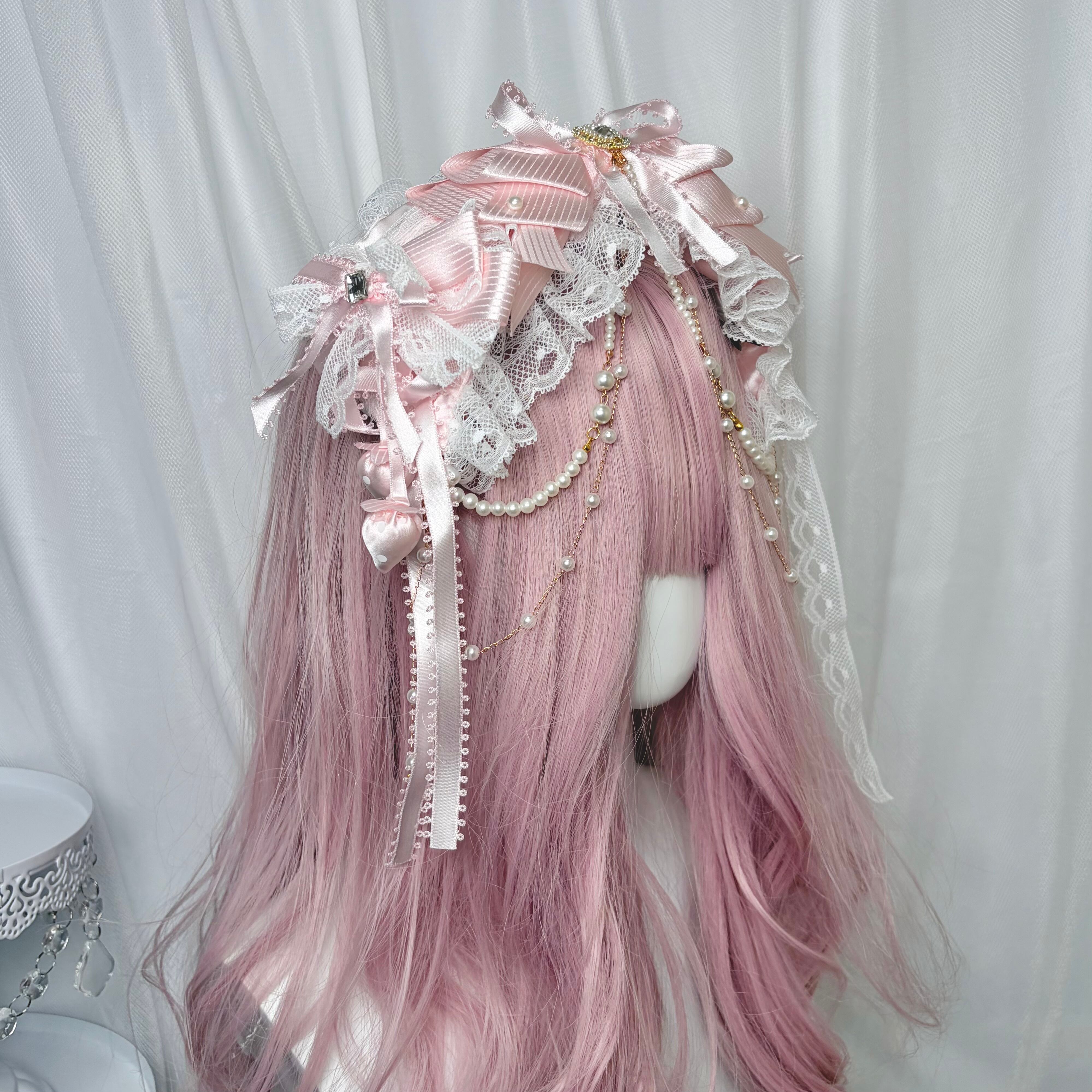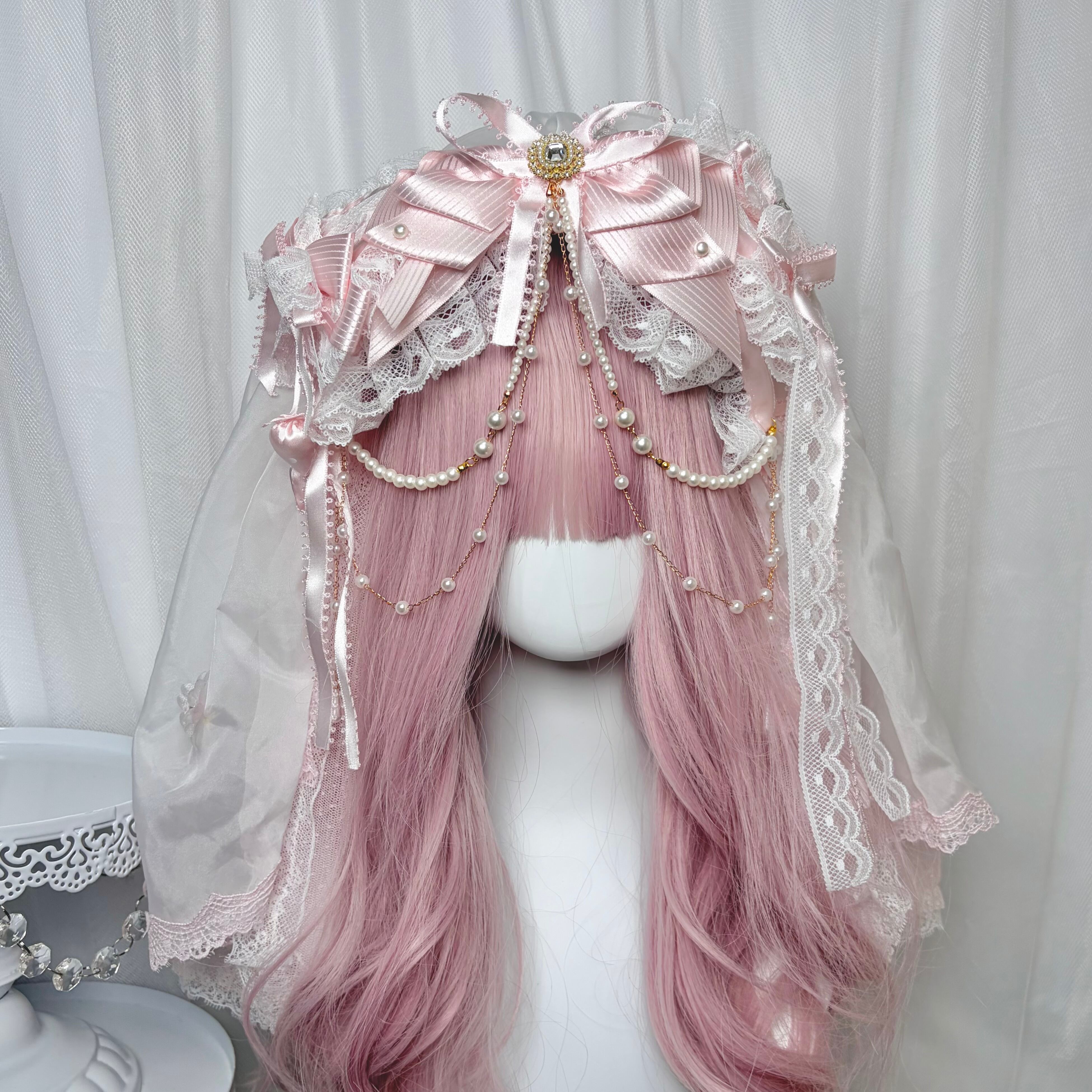 ♡【全2色】Cherry blossom ヴェール付き パールチェーン フリルリボンカチューシャ light blue×pink ♡