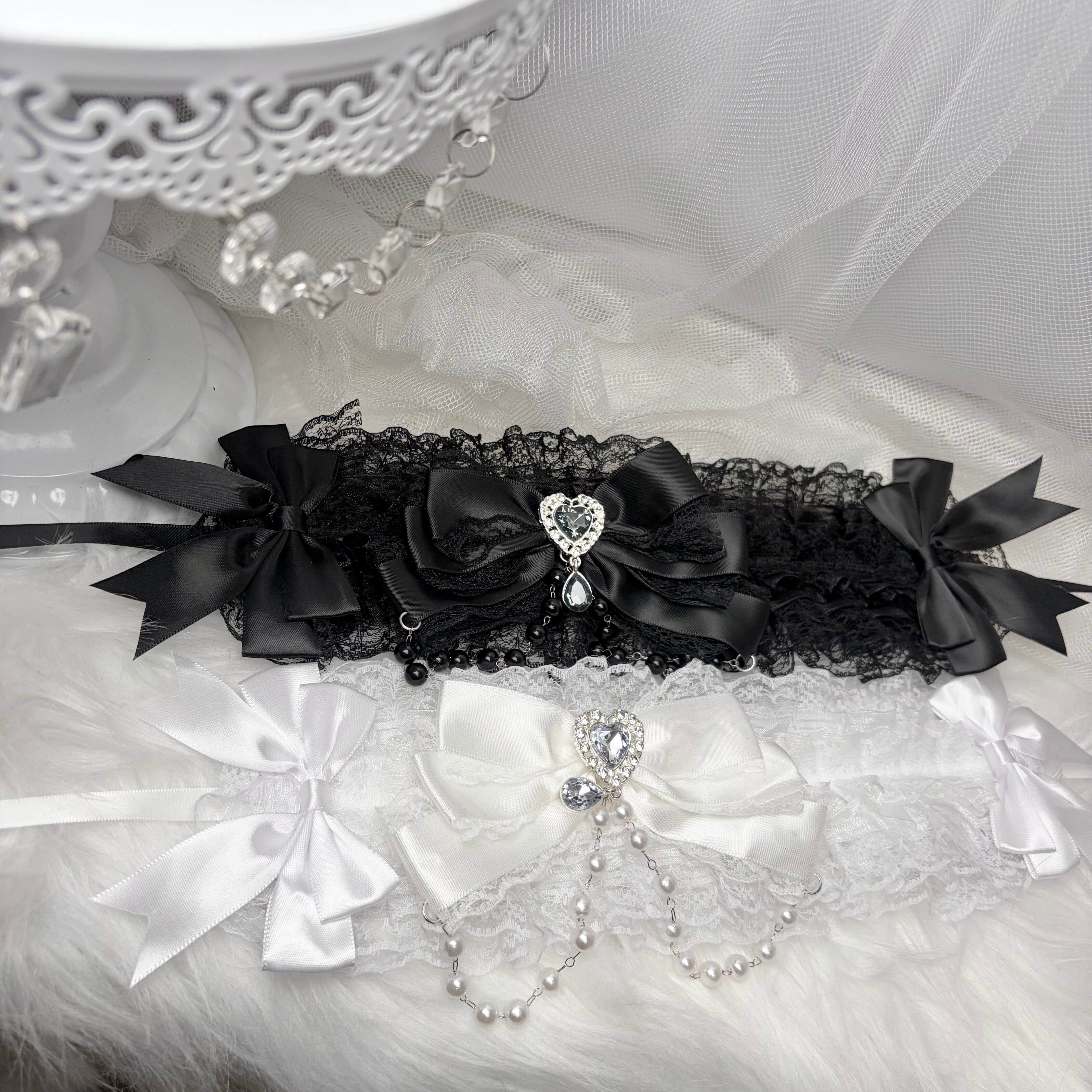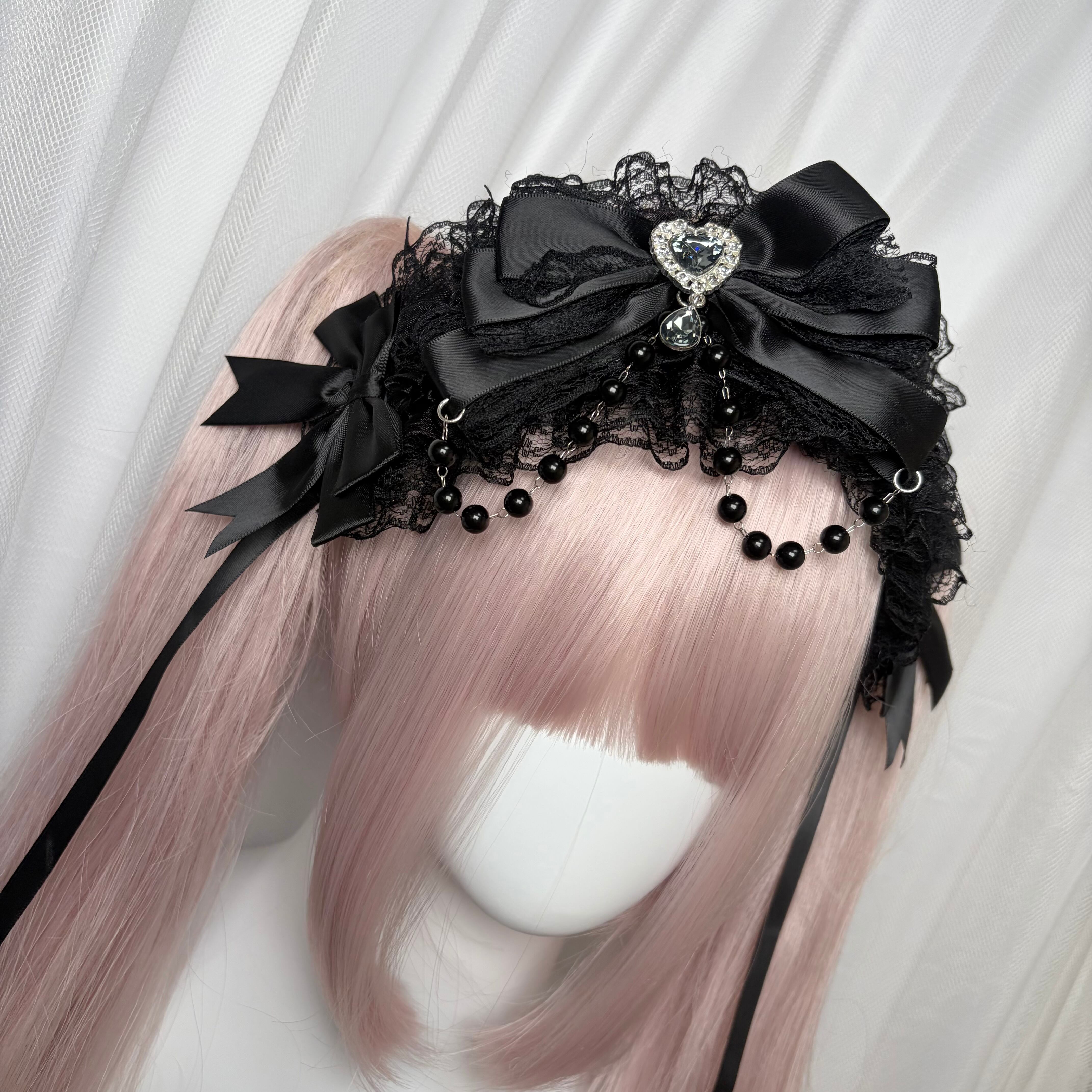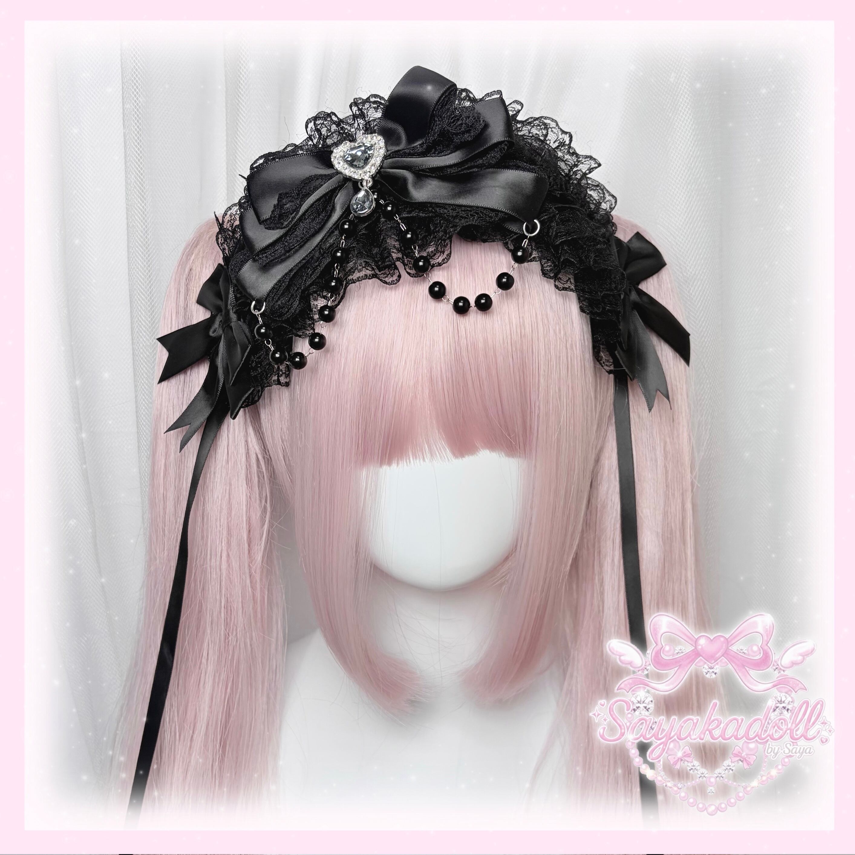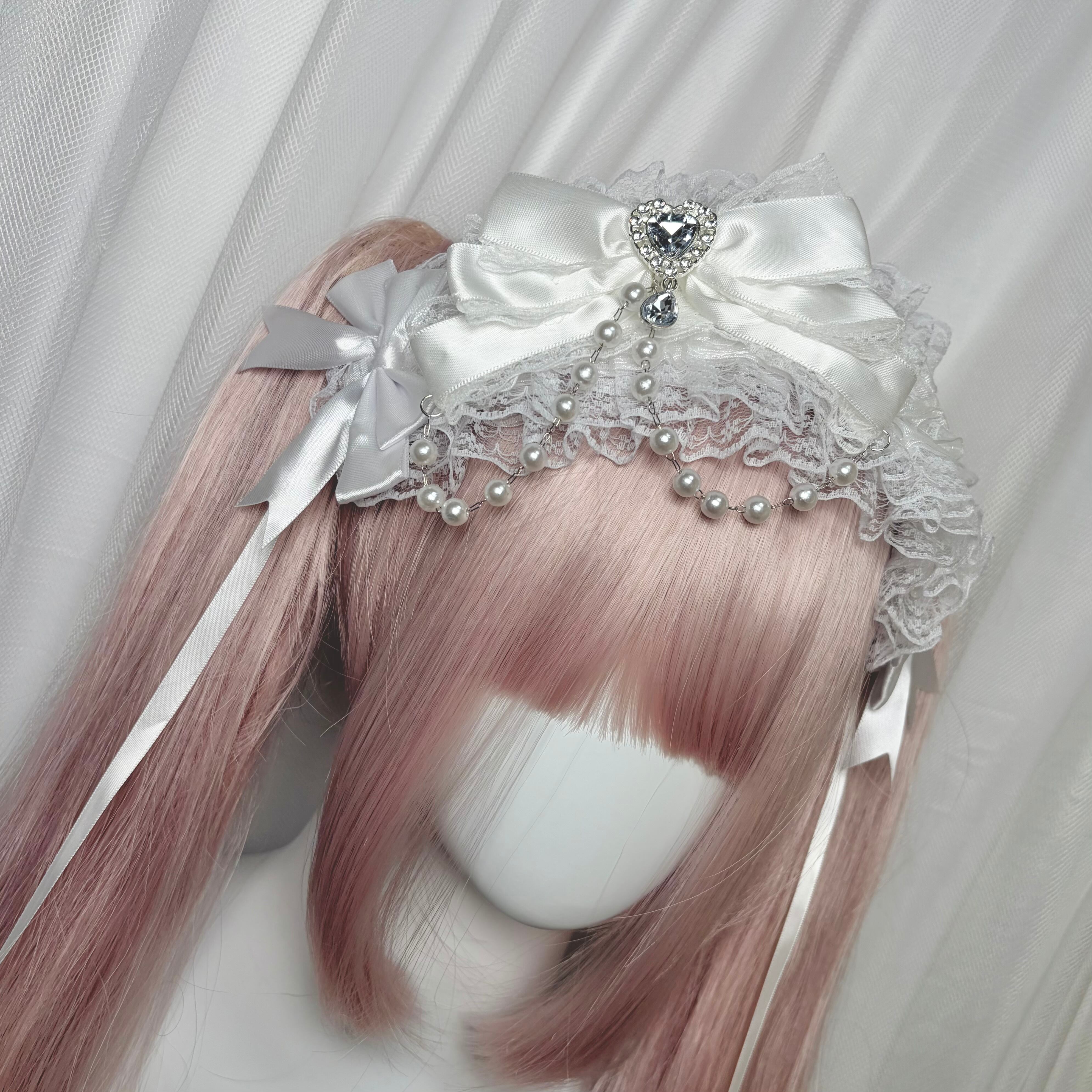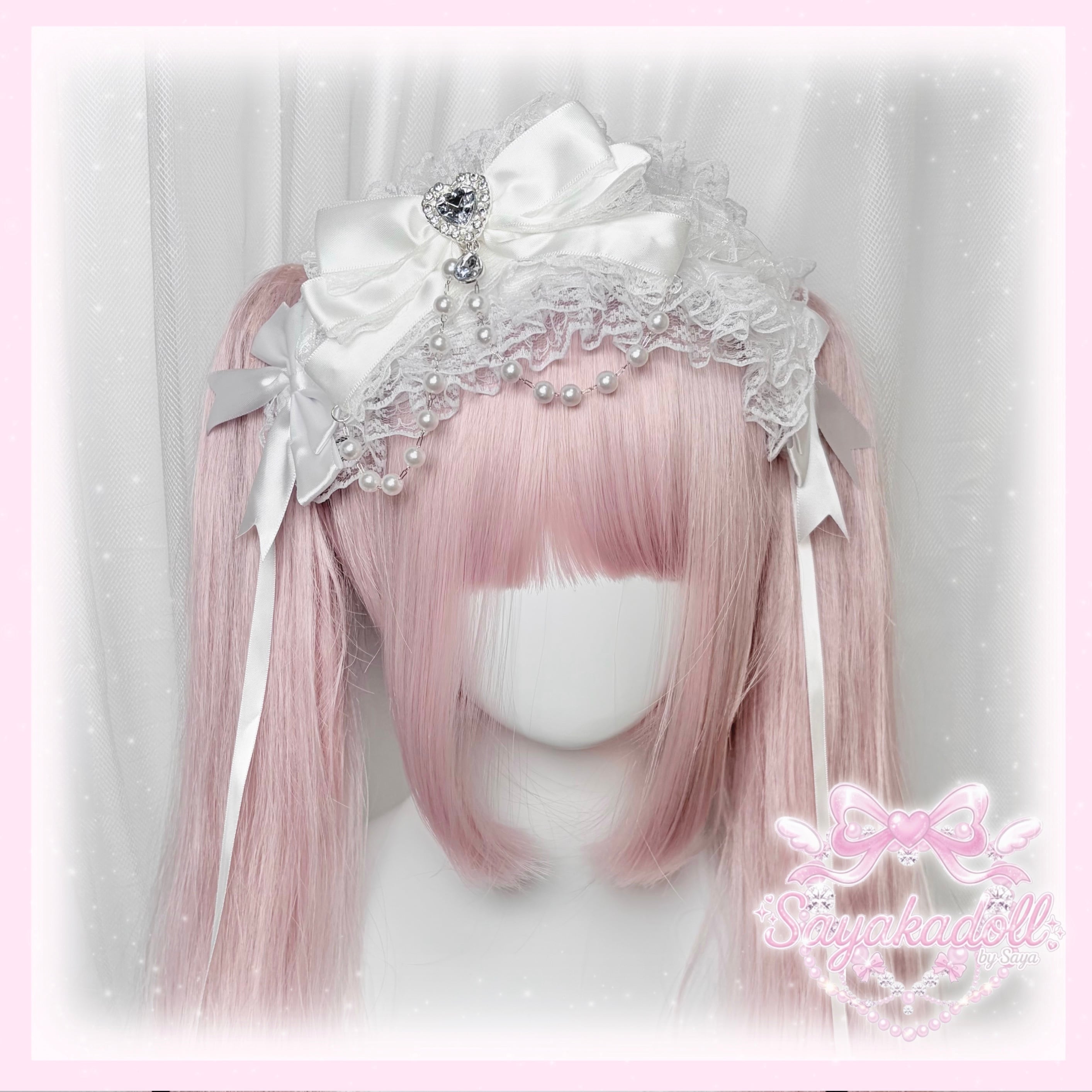 ♡【全2色】地雷系 パールチェーン&クリスタルハート フリルリボンヘッドドレス white ♡